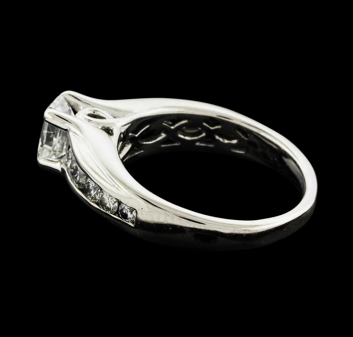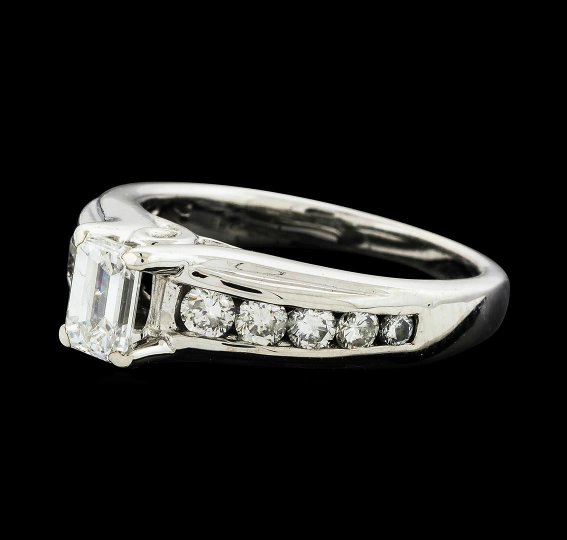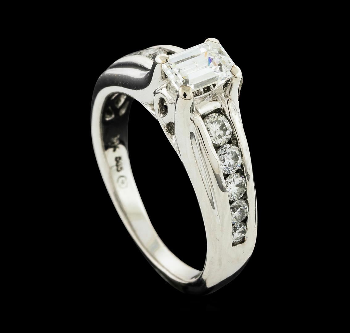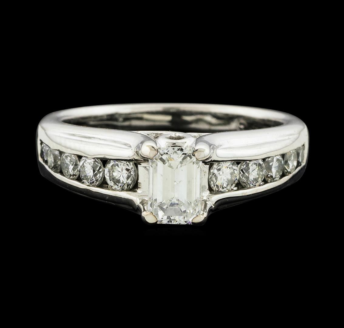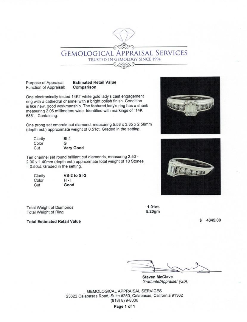 One electronically tested 14KT white gold lady's cast engagement ring with a cathedral channel with a bright polish finish. The featured lady's ring has a shank measuring 2.06 millimeters wide. Identified with markings of "14K 585". Condition is like new, good workmanship. Containing: One prong set emerald cut diamond, measuring 5.58 x 3.85 x 2.58mm (depth est.) approximate weight of 0.51ct. Graded in the setting. Clarity: SI-1. Color: G Cut Very Good Ten channel set round brilliant cut diamonds, measuring 2.50 - 2.00 x 1.40mm (depth est.) approximate total weight of 10 Stones = 0.50ct. Graded in the setting. Clarity: VS-2 to SI-2. Color: H - ICut Good. Total Weight of Diamonds 1.01ct. Total Weight of Ring 5.20gm. GAS Appraised at $4,345.00.
