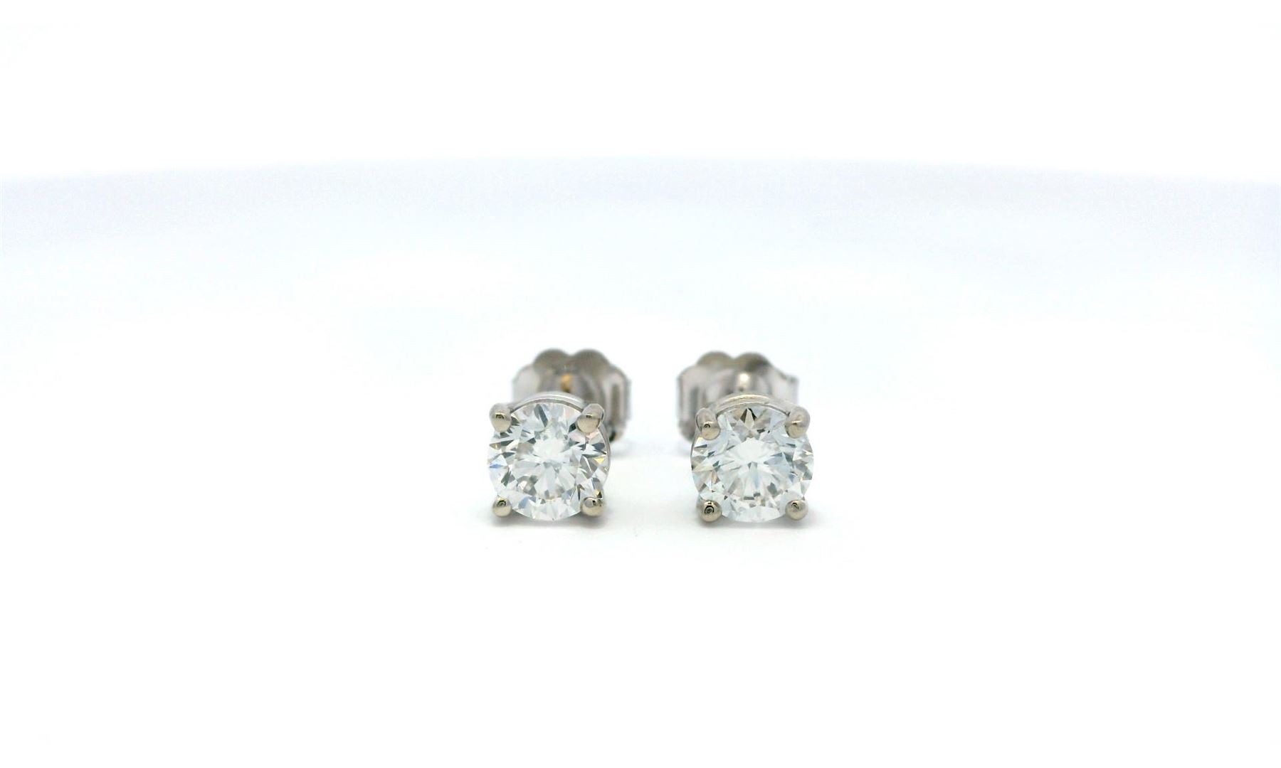 One pair electronically tested 14KT white gold lady's combination cast & assembled fashion stud earrings with heavy friction backs with a four prong basket with a bright polish finish. Condition is new, good workmanship. Identified with markings of "14K". GAS Appraised.