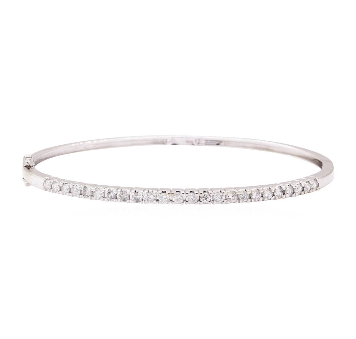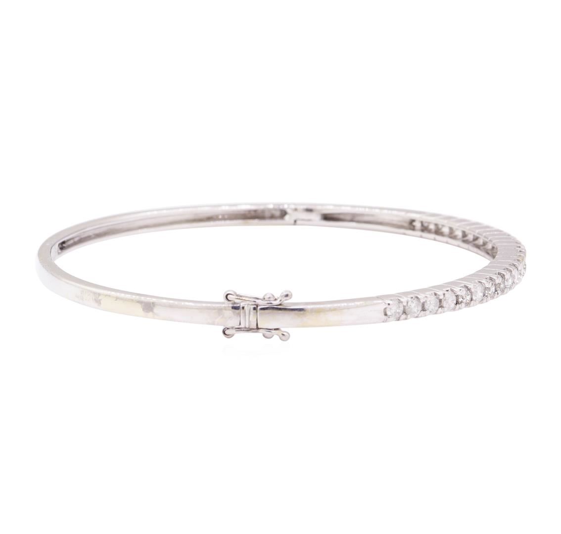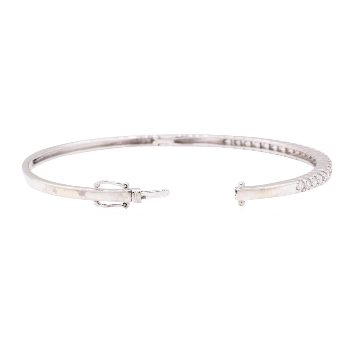 One electronically tested 14KT white gold lady's combination cast & assembled fashion bangle bracelet with a tongue clasp with double foldover safeties with a bright polish finish. The featured lady's bangle bracelet has a circumference of approximately six and a half inches and measures 2.45 millimeters in width. Identified with markings of '14K'. Condition is like new, good workmanship. Containing: Twenty-Four prong set round brilliant cut diamonds, measuring 2.30 - 2.20 x 1.40mm (depth est.) approximate total weight of 24 Stones = 1.03ct. Graded in the setting. Color H - I Clarity SI-3 to I-1 Cut Good. Total Weight of Diamonds 1.03ct. Total Weight of Bangle Bracelet 8.60gm. GAS Appraised.