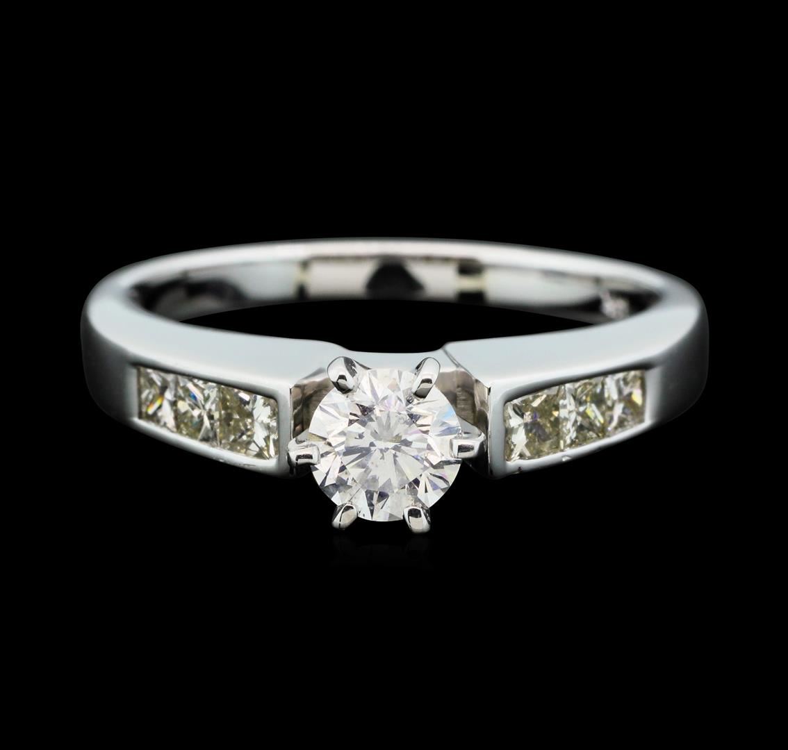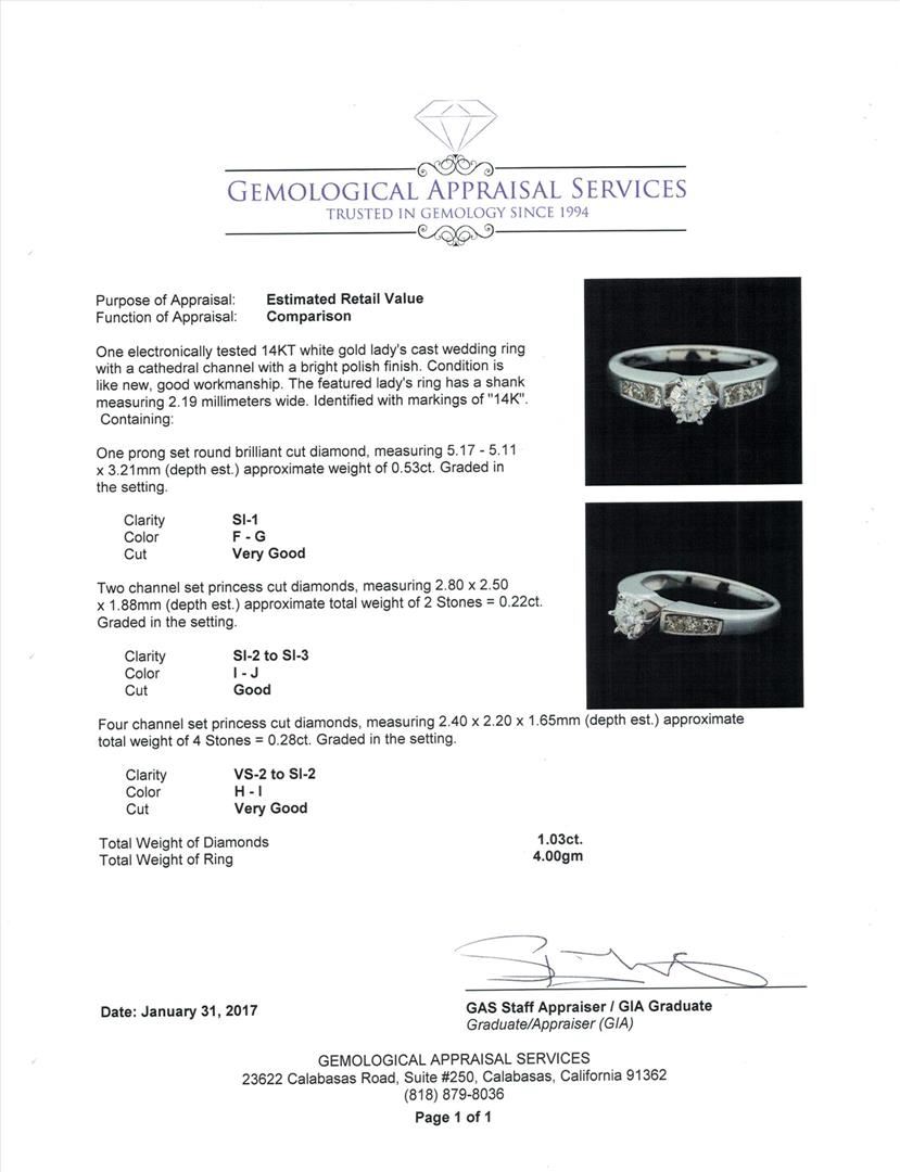 One electronically tested 14KT white gold lady's cast wedding ring with a cathedral channel with a bright polish finish. The featured lady's ring has a shank measuring 2.19 millimeters wide. Identified with markings of "14K". Condition is like new, good workmanship. Containing: One prong set round brilliant cut diamond, measuring 5.17 - 5.11 x 3.21mm (depth est.) approximate weight of 0.53ct. Graded in the setting. Clarity: SI-1. Color: F - GCut Very Good Two channel set princess cut diamonds, measuring 2.80 x 2.50 x 1.88mm (depth est.) approximate total weight of 2 Stones = 0.22ct. Graded in the setting. Clarity: SI-2 to SI-3. Color: I - JCut Good Four channel set princess cut diamonds, measuring 2.40 x 2.20 x 1.65mm (depth est.) approximate total weight of 4 Stones = 0.28ct. Graded in the setting. Clarity: VS-2 to SI-2. Color: H - ICut Very Good. Total Weight of Diamonds 1.03ct. Total Weight of Ring 4.00gm. GAS Appraised.