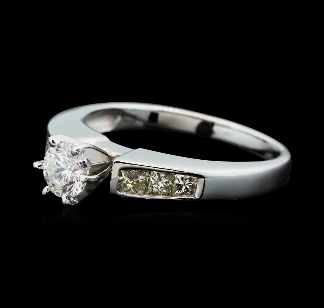 One electronically tested 14KT white gold lady's cast wedding ring with a cathedral channel with a bright polish finish. The featured lady's ring has a shank measuring 2.19 millimeters wide. Identified with markings of "14K". Condition is like new, good workmanship. Containing: One prong set round brilliant cut diamond, measuring 5.17 - 5.11 x 3.21mm (depth est.) approximate weight of 0.53ct. Graded in the setting. Clarity: SI-1. Color: F - GCut Very Good Two channel set princess cut diamonds, measuring 2.80 x 2.50 x 1.88mm (depth est.) approximate total weight of 2 Stones = 0.22ct. Graded in the setting. Clarity: SI-2 to SI-3. Color: I - JCut Good Four channel set princess cut diamonds, measuring 2.40 x 2.20 x 1.65mm (depth est.) approximate total weight of 4 Stones = 0.28ct. Graded in the setting. Clarity: VS-2 to SI-2. Color: H - ICut Very Good. Total Weight of Diamonds 1.03ct. Total Weight of Ring 4.00gm. GAS Appraised.