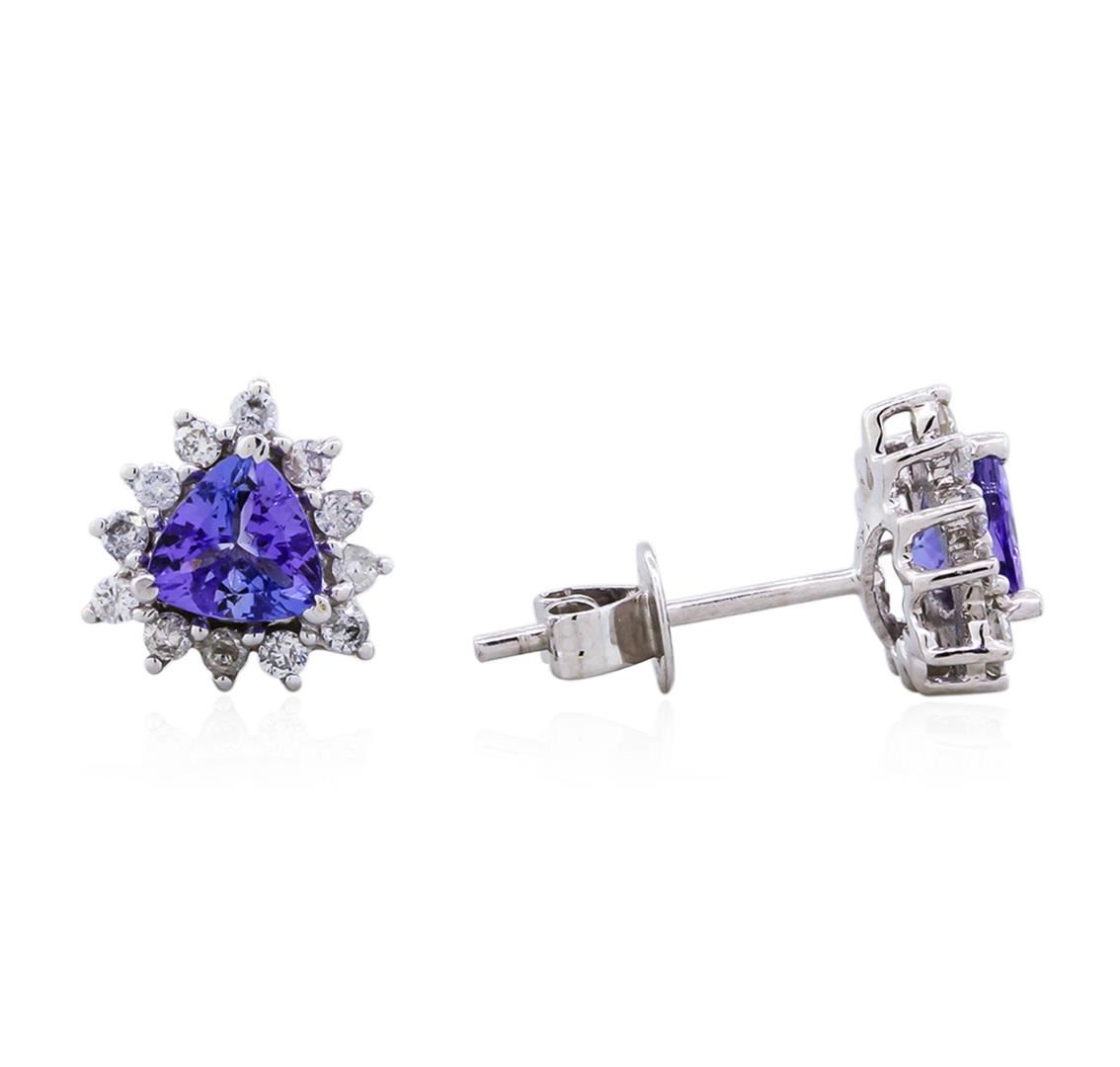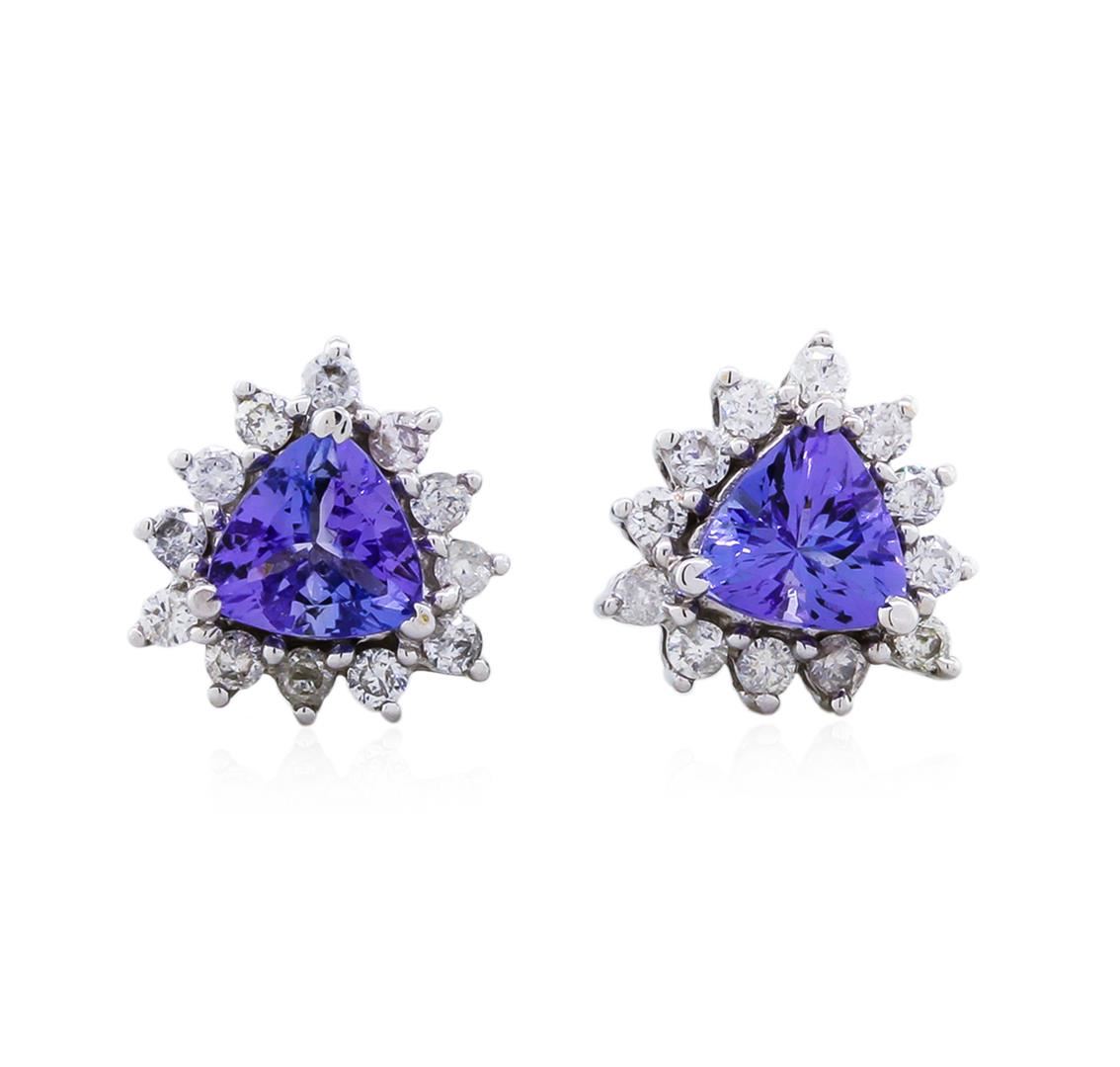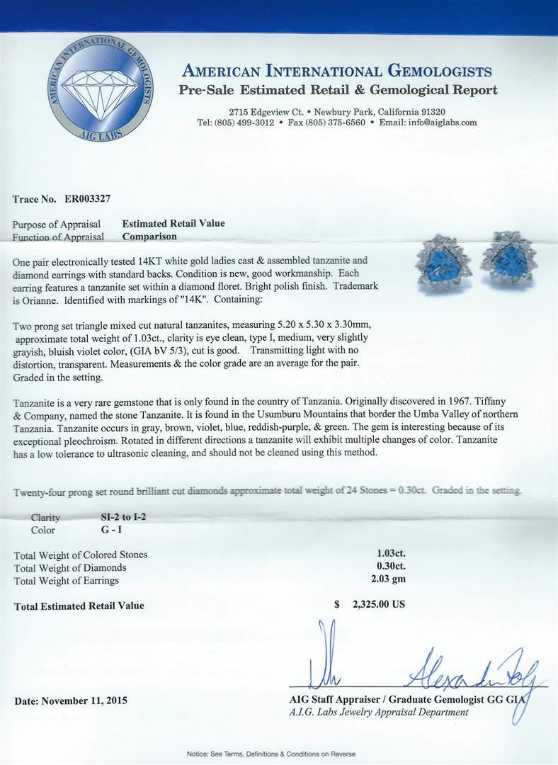 One pair electronically tested 14KT white gold ladies cast & assembled tanzanite and diamond earrings with standard backs. Each earring features a tanzanite set within a diamond floret. Bright polish finish. Trademark is Orianne. Identified with markings of "14K". Condition is new, good workmanship. Containing: Two prong set triangle mixed cut natural tanzanites, measuring 5.20 x 5.30 x 3.30mm, approximate. Total Weight of 1.03ct., clarity is eye clean, type I, medium, very slightly grayish, bluish violet color, (GIA bV 5/3), cut is good. Transmitting light with no distortion, transparent. Measurements & the color grade are an average for the pair.Graded in the setting.Tanzanite is a very rare gemstone that is only found in the country of Tanzania. Originally discovered in 1967. Tiffany & Company, named the stone Tanzanite. It is found in the Usumburu Mountains that border the Umba Valley of northern Tanzania. Tanzanite occurs in gray, brown, violet, blue, reddish-purple, & green. The gem is interesting because of its exceptional pleochroism. Rotated in different directions a tanzanite will exhibit multiple changes of color. Tanzanite has a low tolerance to ultrasonic cleaning, and should not be cleaned using this method.Twenty-Four prong set round brilliant cut diamonds approximate. Total Weight of 24 Stones = 0.30ct. Graded in the setting. Clarity: SI-2 to I-2. Color: G - I. Total Weight of Colored Stones 1.03ct. Total Weight of Diamonds 0.30ct. Total Weight of Earrings 2.03gm. AIG Appraised at $2,325.00.