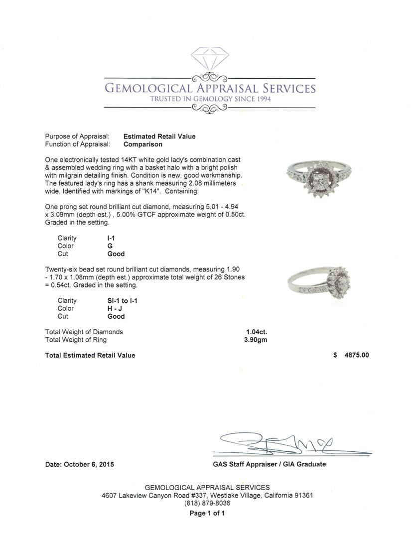 One electronically tested 14KT white gold lady's combination cast & assembled wedding ring with a basket halo with a bright polish with milgrain detailing finish. The featured lady's ring has a shank measuring 2.08 millimeters wide. Identified with markings of "K14". Condition is new, good workmanship. Containing: One prong set round brilliant cut diamond, measuring 5.01 - 4.94 x 3.09mm (depth est.) , 5.00.%. GTCF approximate weight of 0.50ct. Graded in the setting. Clarity: I-1. Color: G. Cut Good Twenty-Six bead set round brilliant cut diamonds, measuring 1.90 - 1.70 x 1.08mm (depth est.) approximate total weight of 26 Stones = 0.54ct. Graded in the setting. Clarity: SI-1 to I-1. Color: H - Good. Total Weight of Diamonds 1.04ct. Total Weight of Ring 3.90gm. GAS Appraised at $4,875.00.