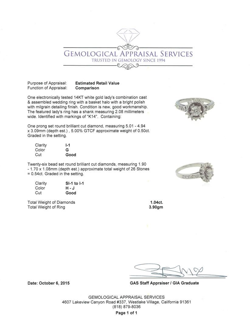One electronically tested 14KT white gold lady's combination cast & assembled wedding ring with a basket halo with a bright polish with milgrain detailing finish. The featured lady's ring has a shank measuring 2.08 millimeters wide. Identified with markings of "K14". Condition is new, good workmanship. Containing: One prong set round brilliant cut diamond, measuring 5.01 - 4.94 x 3.09mm (depth est.) , 5.00.%. GTCF approximate weight of 0.50ct. Graded in the setting. Clarity: I-1. Color: G. Cut Good Twenty-Six bead set round brilliant cut diamonds, measuring 1.90 - 1.70 x 1.08mm (depth est.) approximate total weight of 26 Stones = 0.54ct. Graded in the setting. Clarity: SI-1 to I-1. Color: H - Good. Total Weight of Diamonds 1.04ct. Total Weight of Ring 3.90gm. GAS Appraised at $4,875.00.
