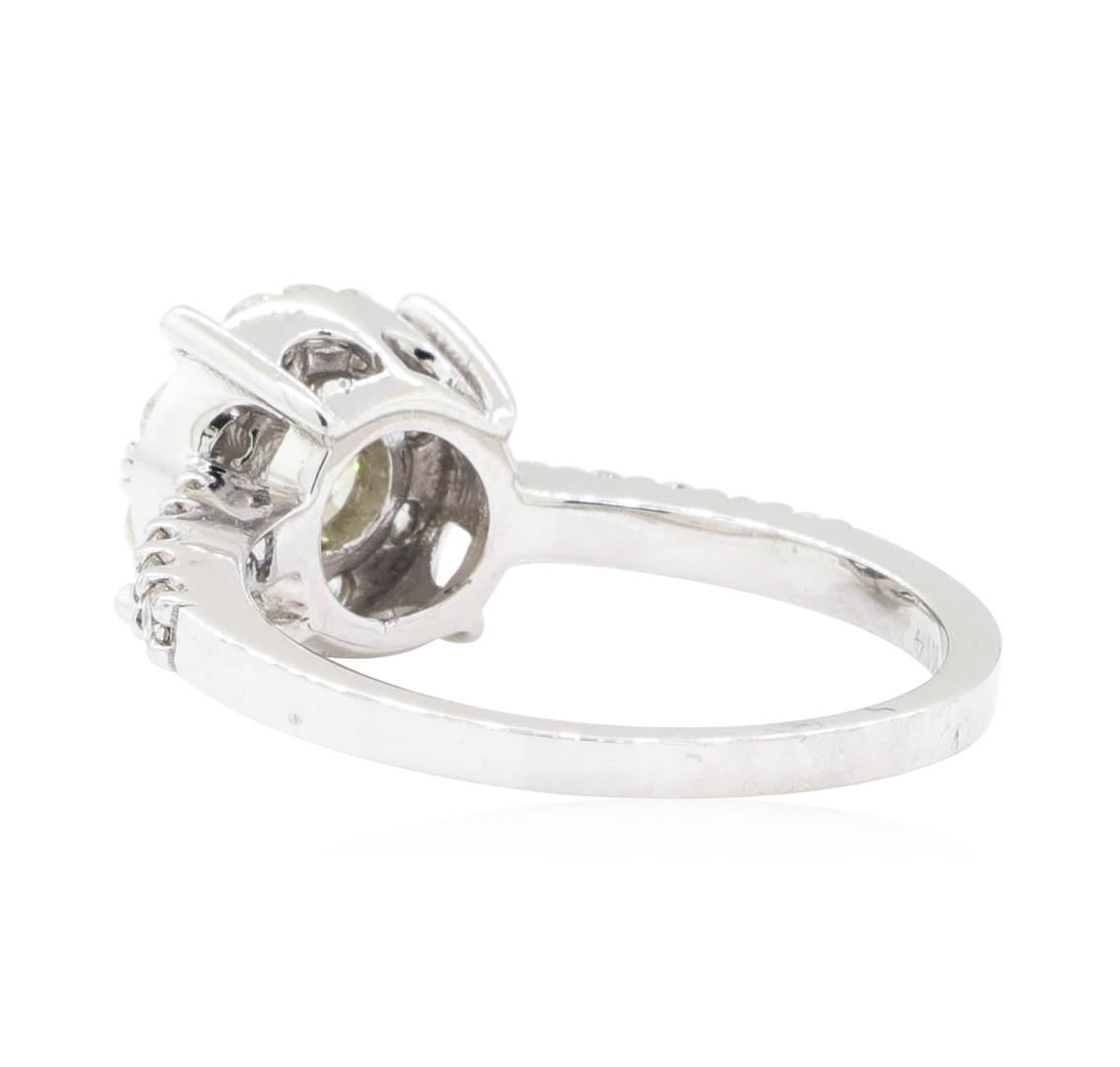One electronically tested 14KT white gold Ladies cast fashion solitaire ring with a bright polish finish. The featured Ladies ring has a shank measuring 1.65 millimeters wide. Identified with markings of 'K14'. Condition is new, good workmanship. Containing: One prong set round brilliant cut diamond, measuring 4.50 - 4.44 x 2.77mm (depth est.) approximate weight of 0.34ct. Graded in the setting. Color I - J Clarity VS-2 Cut Very Good Eight prong set round brilliant cut diamonds, measuring 2.70 - 2.65 x 1.66mm (depth est.) approximate total weight of 8 Stones = 0.58ct. Graded in the setting. Color H - I Clarity VS-2 to SI-1 Cut Very Good Ten prong set round brilliant cut diamonds, measuring 1.60 - 1.50 x 0.96mm (depth est.) approximate total weight of 10 Stones = 0.14ct. Graded in the setting. Color H - I Clarity VS-2 to SI-1 Cut Excellent. Total Weight of Diamonds 1.06ct.. Total Weight of Ring 3.80gm. GAS Appraised.