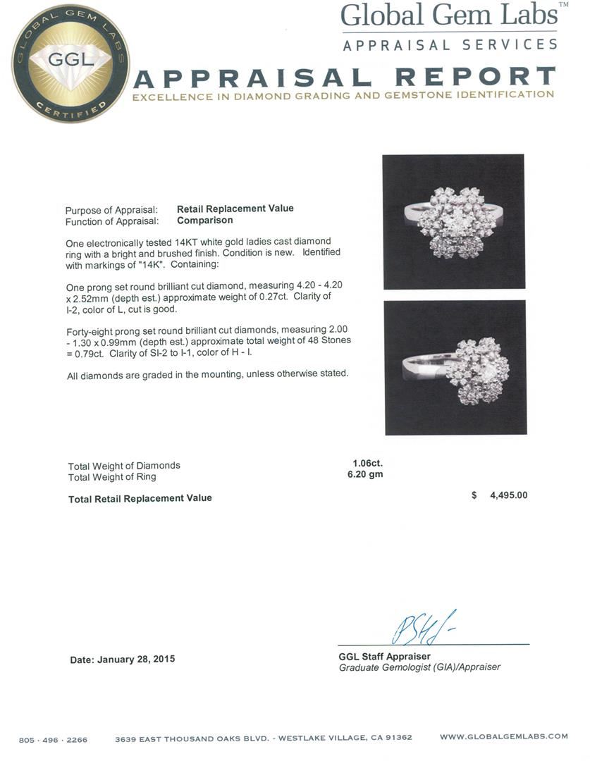 One electronically tested 14KT white gold ladies cast diamond ring with a bright and brushed finish. Identified with markings of "14K". Condition is new. Containing: One prong set round brilliant cut diamond, measuring 4.20 - 4.20 x 2.52mm (depth est.) approximate weight of 0.27ct. Clarity: I-2. Color: L, Cut is Good. Forty-Eight prong set round brilliant cut diamonds, measuring 2.00 - 1.30 x 0.99mm (depth est.) approximate total weight of 48 Stones = 0.79ct. Clarity: SI-2 to I-1. Color: H - I. All diamonds are graded in the mounting, unless otherwise stated. Total Weight of Diamonds 1.06ct. Total Weight of Ring 6.20 grams. GGL Appraised at $4,495.00.