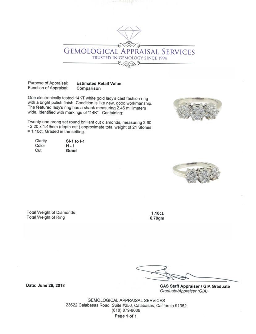 One electronically tested 14KT white gold lady's cast fashion ring with a bright polish finish. The featured lady's ring has a shank measuring 2.46 millimeters wide. Identified with markings of '14K'. Condition is like new, good workmanship. Containing: Twenty-One prong set round brilliant cut diamonds, measuring 2.60 - 2.20 x 1.49mm (depth est.) approximate total weight of 21 Stones = 1.10ct. Graded in the setting. Color H - I Clarity SI-1 to I-1 Cut Good. Total Weight of Diamonds 1.10ct. Total Weight of Ring 6.70gm. GAS Appraised.