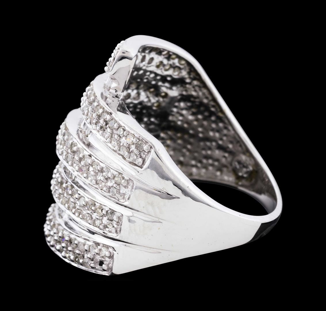 One electronically tested 14KT white gold lady's cast fashion ring with a bright polish finish. The featured lady's ring has a nine row bypass shank measuring 2.11 millimeters wide. Identified with markings of "14K". Condition is new, good workmanship. Containing: One Hundred Sixty-Four prong set single cut diamonds, measuring 1.15 - 1.05 x 0.68mm (depth est.) approximate total weight of 164 Stones = 0.82ct. Graded in the setting. Clarity: I-1 to I-2. Color: H - JCut Good Thirty-Two channel set baguette cut (tapered) diamonds, measuring from 1.20 x 0.95 x 0.81mm (depth est.) to 1.35 x 1.05 x 0.89mm (depth est.) approximate total weight of 32 Stones = 0.28ct. Graded in the setting. Clarity: SI-1 to I-1. Color: H - ICut Good. Total Weight of Diamonds 1.10ct. Total Weight of Ring 5.70gm. GAS Appraised.