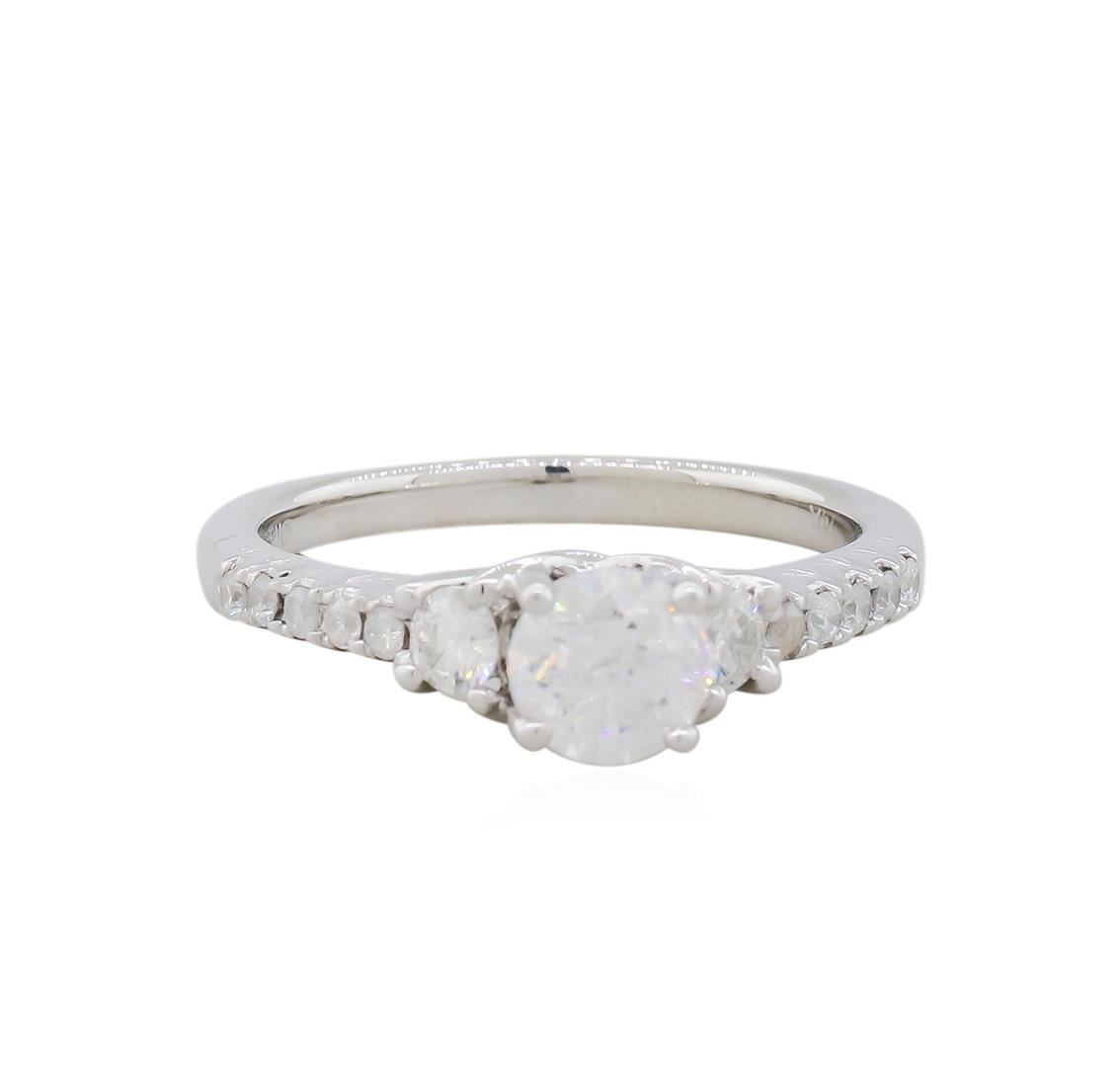 One electronically tested 14KT white gold ladies cast diamond unity ring with a bright polish finish. The featured diamond is cathedral set and supported by diamond set shoulders, completed by a two millimeter wide band. Trademark is Orianne. Identified with markings of "14K". Condition is new, good workmanship. Containing: One prong set round brilliant cut diamond, measuring 5.60 - 5.55 x 3.45mm (depth est.) approximate weight of 0.74ct. Graded in the setting. Clarity: I-1. Color: GDepth 61.9%. Table 59.3%. Twelve prong set round brilliant cut diamonds approximate. Total Weight of 12 Stones = 0.37ct. Graded in the setting. Clarity: I-1 to I-2. Color: G - I. Total Weight of Diamonds 1.11ct. AIG Appraised at $7,535.00.