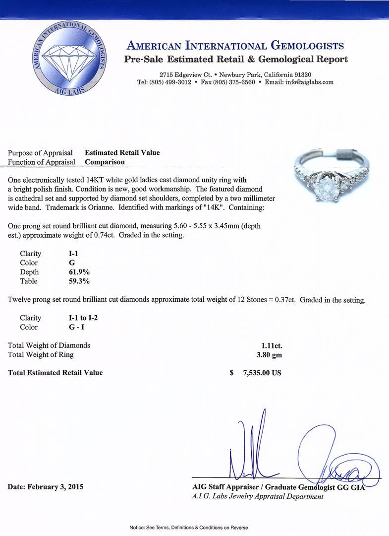 One electronically tested 14KT white gold ladies cast diamond unity ring with a bright polish finish. The featured diamond is cathedral set and supported by diamond set shoulders, completed by a two millimeter wide band. Trademark is Orianne. Identified with markings of "14K". Condition is new, good workmanship. Containing: One prong set round brilliant cut diamond, measuring 5.60 - 5.55 x 3.45mm (depth est.) approximate weight of 0.74ct. Graded in the setting. Clarity: I-1. Color: GDepth 61.9%. Table 59.3%. Twelve prong set round brilliant cut diamonds approximate. Total Weight of 12 Stones = 0.37ct. Graded in the setting. Clarity: I-1 to I-2. Color: G - I. Total Weight of Diamonds 1.11ct. AIG Appraised at $7,535.00.