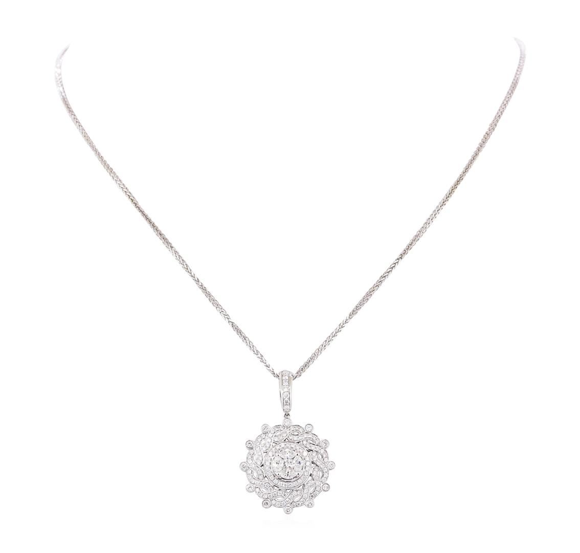 One electronically tested 14KT white gold lady's combination cast & assembled fashion pendant & chain 16.0' long, 1.1mm square wheat link with a lobster claw clasp with a bright polish finish. The featured lady's pendant has a braided double halo with a diameter of approximately 22 millimeters. Identified with markings of '14K'. Condition is new, good workmanship. Containing: One invisible set princess cut diamond, measuring 2.40 x 2.40 x 1.80mm (depth est.) approximate weight of 0.09ct. Graded in the setting. Color H - I, Clarity VS-2, Cut Good Four prong set marquise shaped cut diamonds, measuring 4.00 x 2.50 x 1.58mm (depth est.) approximate total weight of 4 Stones = 0.37ct. Graded in the setting. Color H - I, Clarity VS-2 to SI-1, Cut Good Twelve bezel set round brilliant cut diamonds, measuring 1.60 - 1.55 x 0.98mm (depth est.) approximate total weight of 12 Stones = 0.18ct. Graded in the setting. Color H - I, Clarity VS-2 to SI-1, Cut Good One Hundred Sixteen prong set round brilliant cut diamonds, measuring 1.10 - 1.00 x 0.65mm (depth est.) approximate total weight of 116 Stones = 0.50ct. Graded in the setting. Color H - I, Clarity VS-2 to SI-1, Cut Good. Total Weight of Diamonds 1.14ct. Total Weight of Pendant & Chain 9.40gm. GAS Appraised.