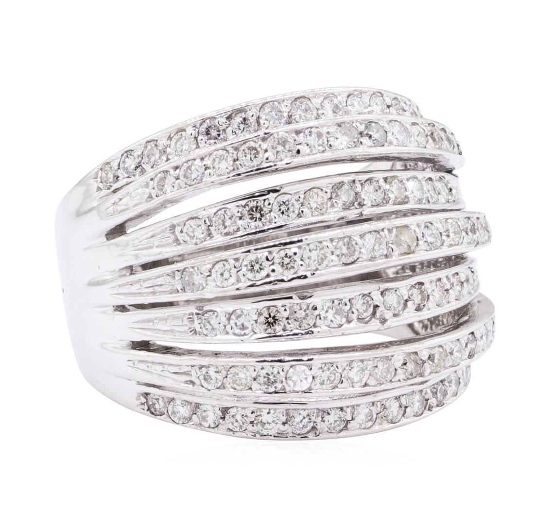 One electronically tested 14KT white gold lady's cast fashion ring with a domed seven row motif with a bright polish finish. The featured lady's ring has a shank measuring 5.15 millimeters wide. Identified with markings of '585'. Condition is like new, good workmanship. Containing: Ninety-Two prong set round brilliant cut diamonds, measuring 1.50 - 1.45 x 0.92mm (depth est.) approximate total weight of 92 Stones = 1.15ct. Graded in the setting. Color I - J, Clarity SI-1 to I-1, Cut Good. Total Weight of Diamonds 1.15ct. Total Weight of Ring 9.90gm. GAS Appraised.