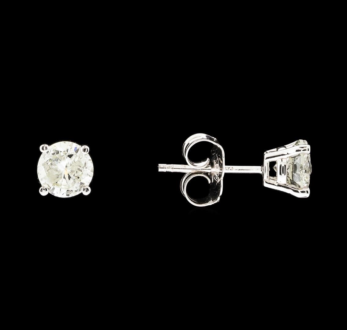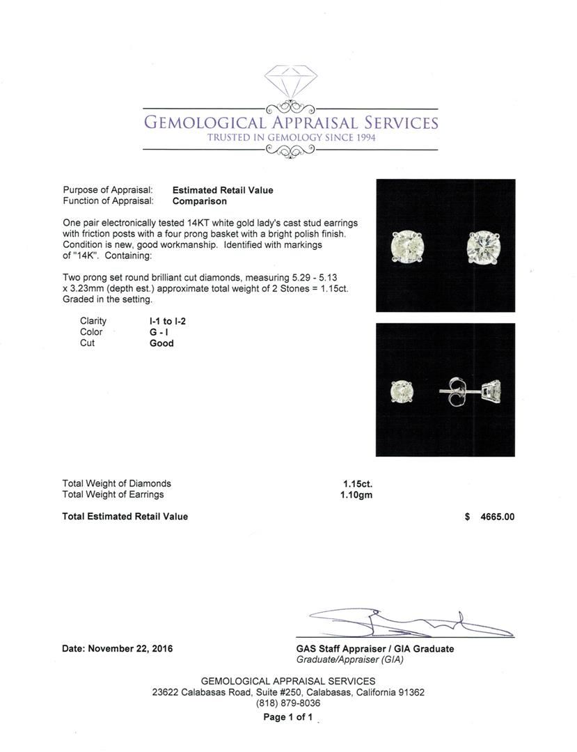 One pair electronically tested 14KT white gold lady's cast stud earrings with friction posts with a four prong basket with a bright polish finish. Identified with markings of "14K". Condition is new, good workmanship. Containing: Two prong set round brilliant cut diamonds, measuring 5.29 - 5.13 x 3.23mm (depth est.) approximate total weight of 2 Stones = 1.15ct. Graded in the setting. Clarity: I-1 to I-2. Color: G - ICut Good. Total Weight of Diamonds 1.15ct. Total Weight of Earrings 1.10gm. GAS Appraised at $4,665.00.