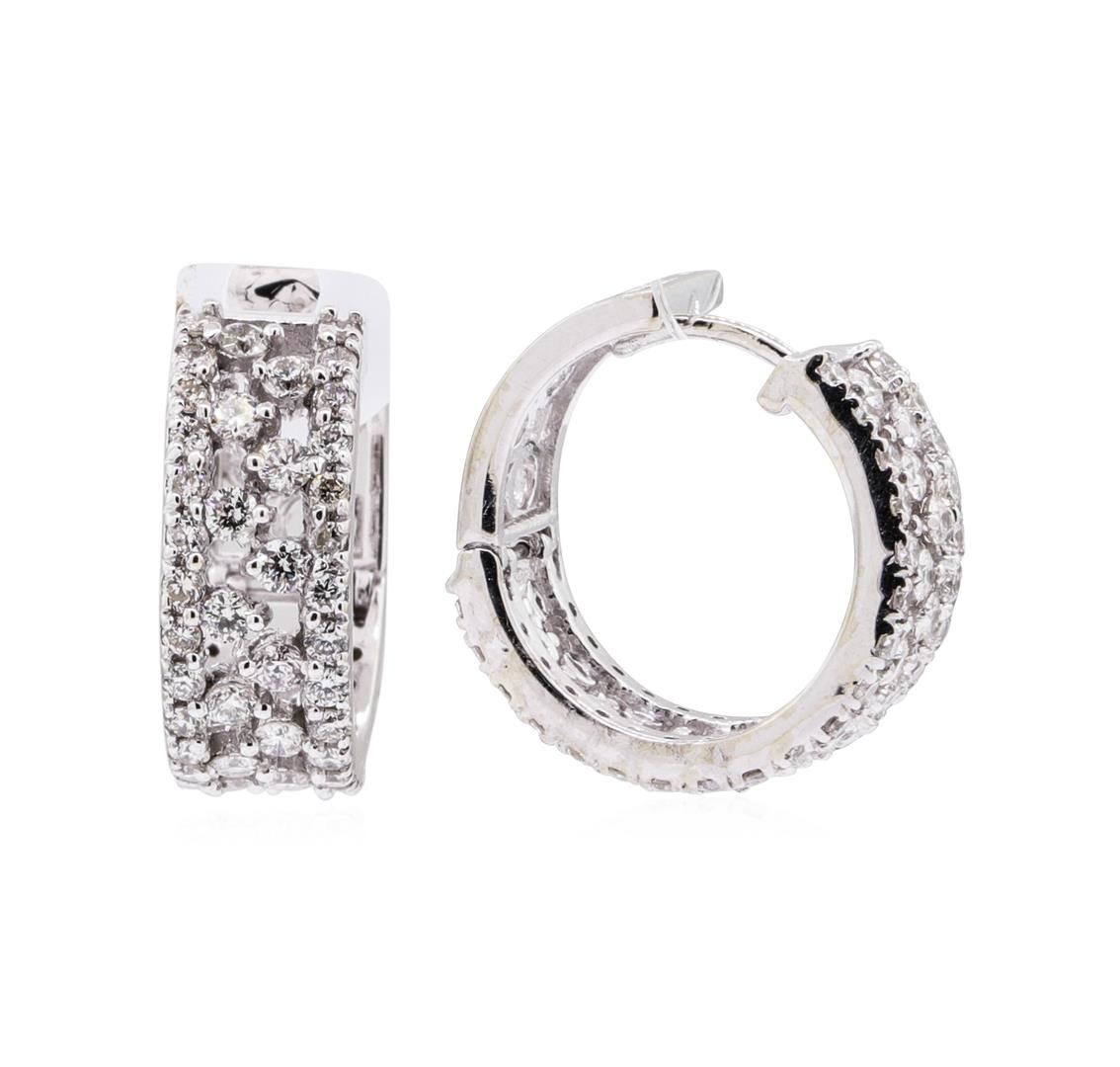 One pair electronically tested 14KT white gold lady's combination cast & assembled fashion hoop style earrings with hinged, snap locking posts with a bright polish finish. The featured ladies earrings have a double row of staggered diamonds with a circumference of 16 millimeters. Identified with markings of 'K14'. Condition is new, good workmanship. Containing: Thirty-Six prong set round brilliant cut diamonds, measuring 1.70 - 1.65 x 1.04mm (depth est.) approximate total weight of 36 Stones = 0.64ct. Graded in the setting. Color H - I, Clarity VS-2 to SI-1, Cut Very Good Seventy-Six prong set round brilliant cut diamonds, measuring 1.30 - 1.25 x 0.78mm (depth est.) approximate total weight of 76 Stones = 0.55ct. Graded in the setting. Color H - I, Clarity VS-2 to SI-1, Cut Very Good. Total Weight of Diamonds 1.19ct. Total Weight of Earrings 5.10gm. GAS Appraised.