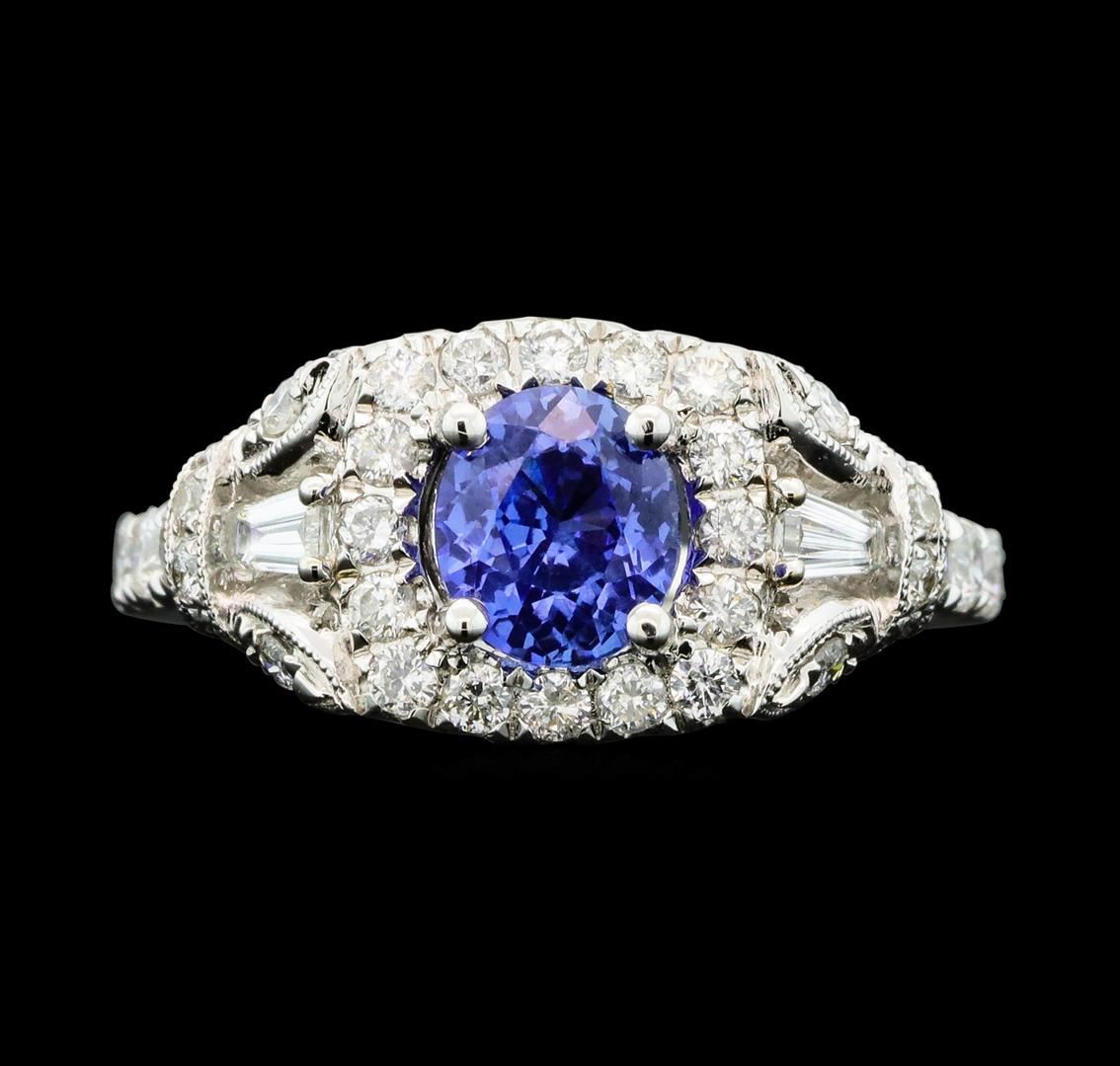 One electronically tested 14KT white gold ladies cast & assembled sapphire and diamond ring. The featured sapphire is set within a diamond bezel supported by a diamond set under gallery and stylized diamond set shoulders, completed by a two millimeter wide band. Bright polish finish with milgrain detailing. Trademark is UCG. Identified with markings of "14K". Condition is new, good workmanship. Containing: One prong set oval modified brilliant cut natural blue sapphire, measuring 6.47 x 5.62 x 3.98mm, exact weight 1.19ct., clarity is eye clean, type II, medium dark, very slightly grayish, blue color, (GIA B 6/3), cut is good. Transmitting light with no distortion, transparent. No indications of heating. GIA Colored Stone Grading Report attached. Graded loose prior to setting in the GIA Laboratory, Report # 1172489086.Two prong set baguette cut (tapered) diamonds, measuring 3.90 x 1.80 x 1.26mm (depth est.) approximate total weight of 2 Stones = 0.17ct. Graded in the setting. Clarity: VVS-2 to VS-1. Color: G Forty-Four prong set round brilliant cut diamonds approximate total weight of 44 Stones = 0.61ct. Graded in the setting. Clarity: SI-2 to I-2. Color: F - H. Total Weight of Colored Stones 1.19ct. Total Weight of Diamonds 0.78ct. Total Weight of Ring 5.00gm. AIG Appraised.