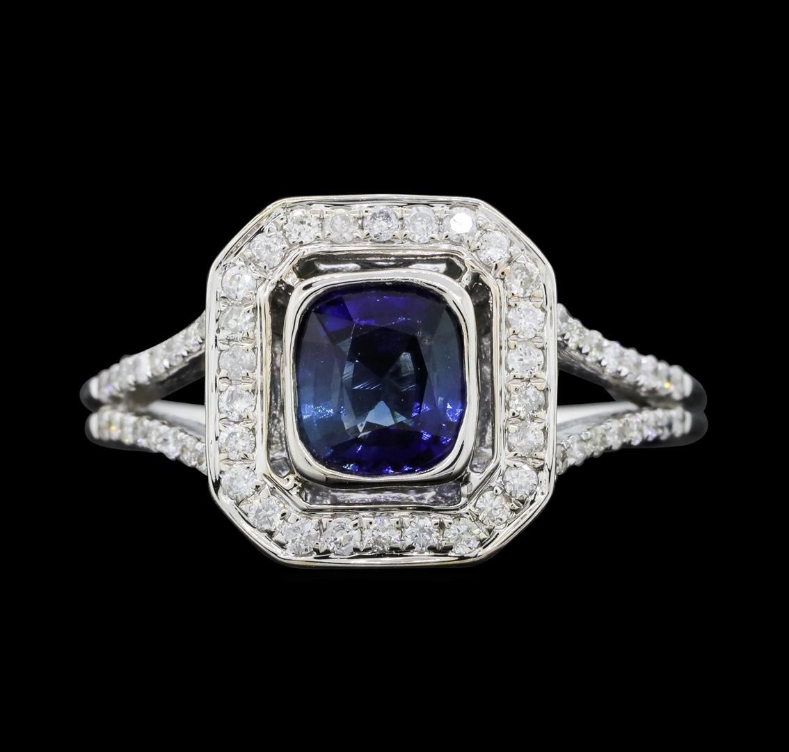 One electronically tested 14KT white gold ladies cast sapphire and diamond ring with a bright polish finish. The featured sapphire is set within a diamond bezel supported by a lattice under gallery and diamond set split shoulders, completed by a one and one-half millimeter wide band. Trademark is Orianne. Identified with markings of "14K". Condition is new, good workmanship. Containing: One bezel set rectangular cushion mixed cut natural blue sapphire, measuring 6.20 x 5.40 x 3.55mm, approximate weight of 1.19ct., clarity is eye clean, type II, dark, very slightly grayish, blue color, (GIA B 7/3), cut is good. Transmitting light with no distortion, transparent. No indications of heating. Graded in the setting. Ninety-Two bead set round brilliant cut diamonds approximate total weight of 92 Stones = 0.45ct. Graded in the setting. Clarity: I-1 to I-3. Color: G - I. Total Weight of Colored Stones 1.19ct. Total Weight of Diamonds 0.45ct. Total Weight of Ring 3.51gm. AIG Appraised.