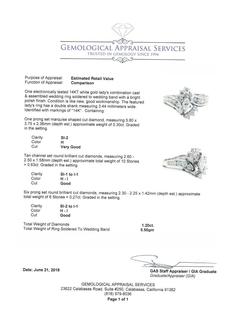 One electronically tested 14KT white gold lady's combination cast & assembled wedding ring soldered to wedding band with a bright polish finish. The featured lady's ring has a double shank measuring 3.44 millimeters wide. Identified with markings of '14K'. Condition is like new, good workmanship. Containing: One prong set marquise shaped cut diamond, measuring 5.80 x 3.75 x 2.36mm (depth est.) approximate weight of 0.30ct. Graded in the setting. Color H Clarity SI-2 Cut Very Good Ten channel set round brilliant cut diamonds, measuring 2.60 - 2.50 x 1.58mm (depth est.) approximate total weight of 10 Stones = 0.63ct. Graded in the setting. Color H - I Clarity SI-1 to I-1 Cut Good Six prong set round brilliant cut diamonds, measuring 2.30 - 2.25 x 1.42mm (depth est.) approximate total weight of 6 Stones = 0.27ct. Graded in the setting. Color H - I Clarity SI-2 to I-1 Cut Good. Total Weight of Diamonds 1.20ct. Total Weight of Ring Soldered To Wedding Band 5.50gm. GAS Appraised.