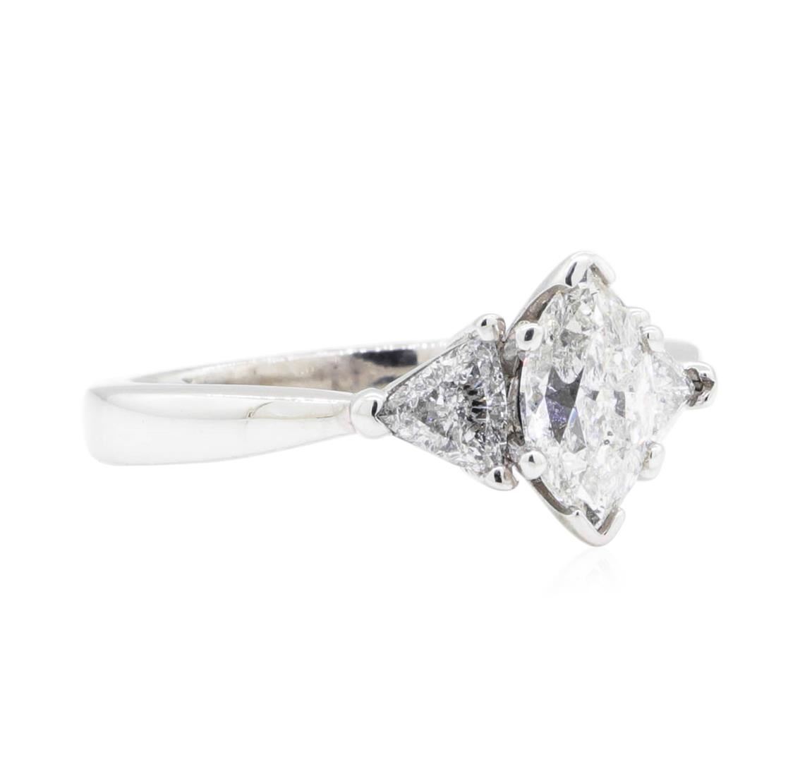One electronically tested 14KT white gold Ladies cast fashion wedding ring with a three stone cathedral shank with a bright polish finish. The featured Ladies ring has a shank measuring 2.37 millimeters wide. Identified with markings of '14K'. Condition is new, good workmanship. Containing: One prong set marquise shaped cut diamond, measuring 8.60 x 4.90 x 3.00mm (depth est.) approximate weight of 0.70ct. Graded in the setting. Color H - I Clarity SI-2 Cut Good Two prong set triangle brilliant cut diamonds, measuring 4.30 x 4.10 x 2.55mm (depth est.) approximate total weight of 2 Stones = 0.50ct. Graded in the setting. Color H - I Clarity SI-2 to I-1 Cut Good. Total Weight of Diamonds 1.20ct.. Total Weight of Ring 4.30gm. GAS Appraised.