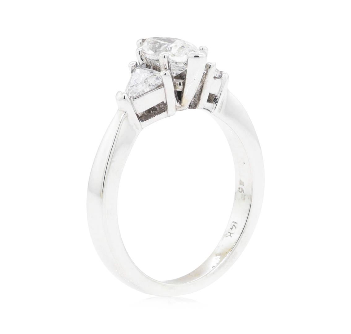 One electronically tested 14KT white gold Ladies cast fashion wedding ring with a three stone cathedral shank with a bright polish finish. The featured Ladies ring has a shank measuring 2.37 millimeters wide. Identified with markings of '14K'. Condition is new, good workmanship. Containing: One prong set marquise shaped cut diamond, measuring 8.60 x 4.90 x 3.00mm (depth est.) approximate weight of 0.70ct. Graded in the setting. Color H - I Clarity SI-2 Cut Good Two prong set triangle brilliant cut diamonds, measuring 4.30 x 4.10 x 2.55mm (depth est.) approximate total weight of 2 Stones = 0.50ct. Graded in the setting. Color H - I Clarity SI-2 to I-1 Cut Good. Total Weight of Diamonds 1.20ct.. Total Weight of Ring 4.30gm. GAS Appraised.