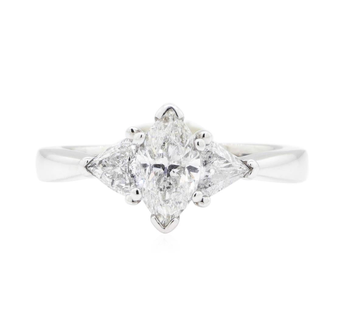 One electronically tested 14KT white gold Ladies cast fashion wedding ring with a three stone cathedral shank with a bright polish finish. The featured Ladies ring has a shank measuring 2.37 millimeters wide. Identified with markings of '14K'. Condition is new, good workmanship. Containing: One prong set marquise shaped cut diamond, measuring 8.60 x 4.90 x 3.00mm (depth est.) approximate weight of 0.70ct. Graded in the setting. Color H - I Clarity SI-2 Cut Good Two prong set triangle brilliant cut diamonds, measuring 4.30 x 4.10 x 2.55mm (depth est.) approximate total weight of 2 Stones = 0.50ct. Graded in the setting. Color H - I Clarity SI-2 to I-1 Cut Good. Total Weight of Diamonds 1.20ct.. Total Weight of Ring 4.30gm. GAS Appraised.