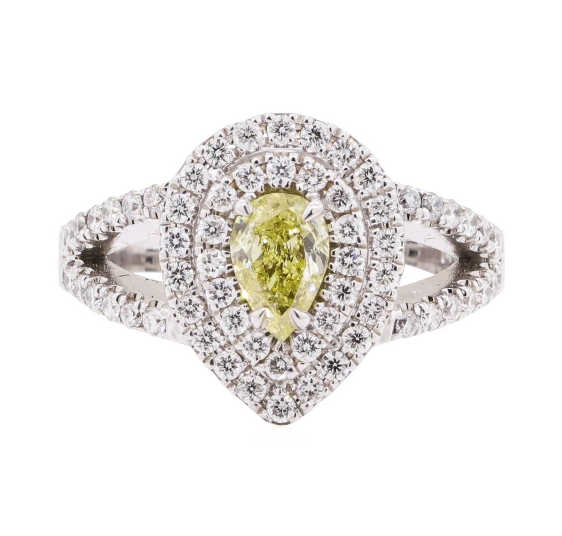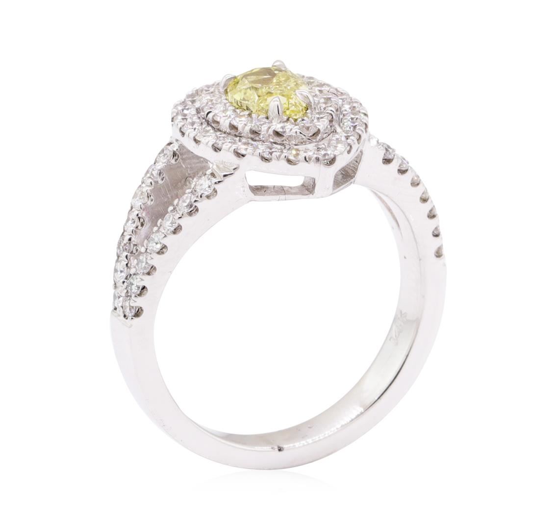 One electronically tested 14KT white gold lady's cast fashion ring with a split shank double halo with a bright polish finish. The featured lady's ring has a shank measuring 2.90 millimeters wide. Identified with markings of '14K'. Condition is new, good workmanship. Containing: One pear shaped cut diamond, measuring 6.67 x 4.36 x 2.83mm (depth est.) , 10.00.%. GTCF approximate weight of 0.56ct. Graded in the setting. Color Fancy Intense Yellow, Clarity I-1 Sixty-Six prong set round brilliant cut diamonds, measuring 1.40 - 1.35 x 0.86mm (depth est.) approximate total weight of 66 Stones = 0.66ct. Graded in the setting. Color G - H, Clarity VS-2 to SI-1, Cut Very Good. Total Weight of Diamonds 1.22ct. Total Weight of Ring 5.50gm. GAS Appraised.