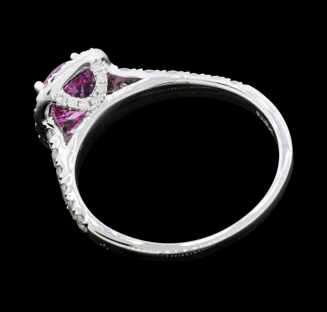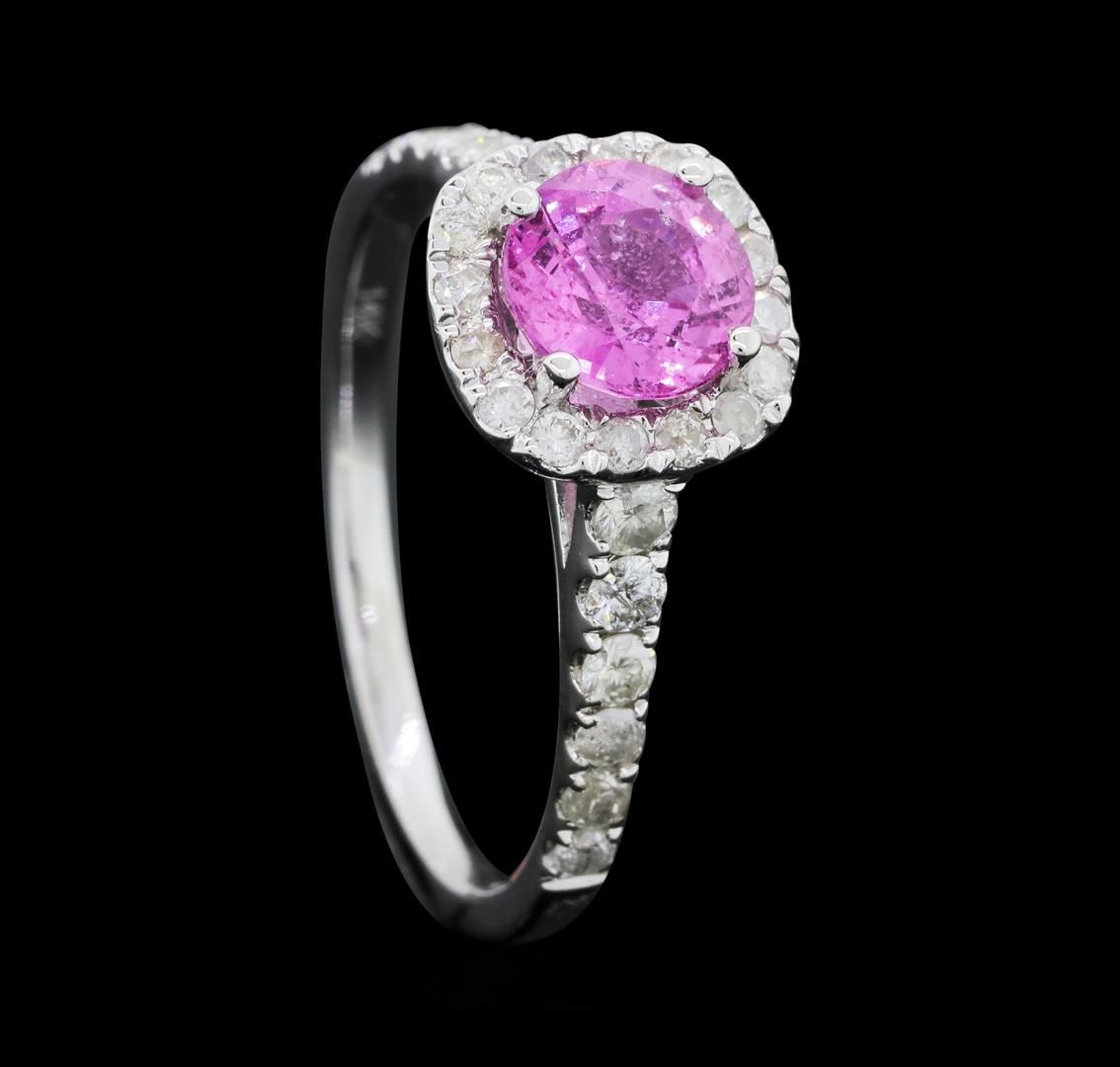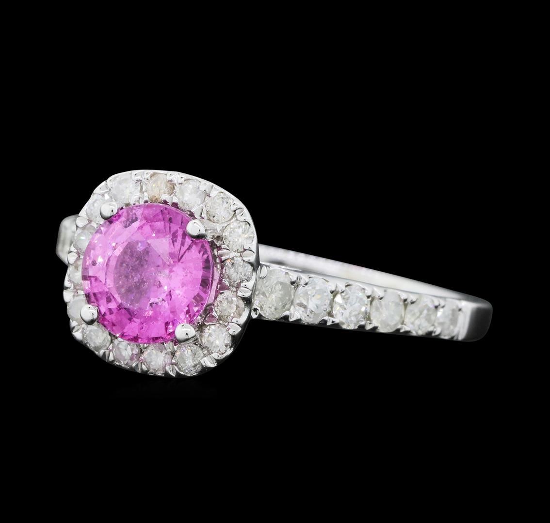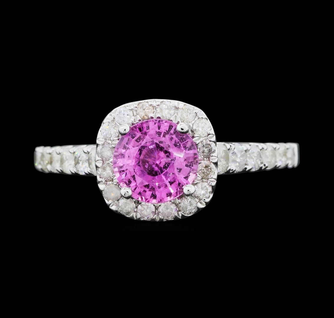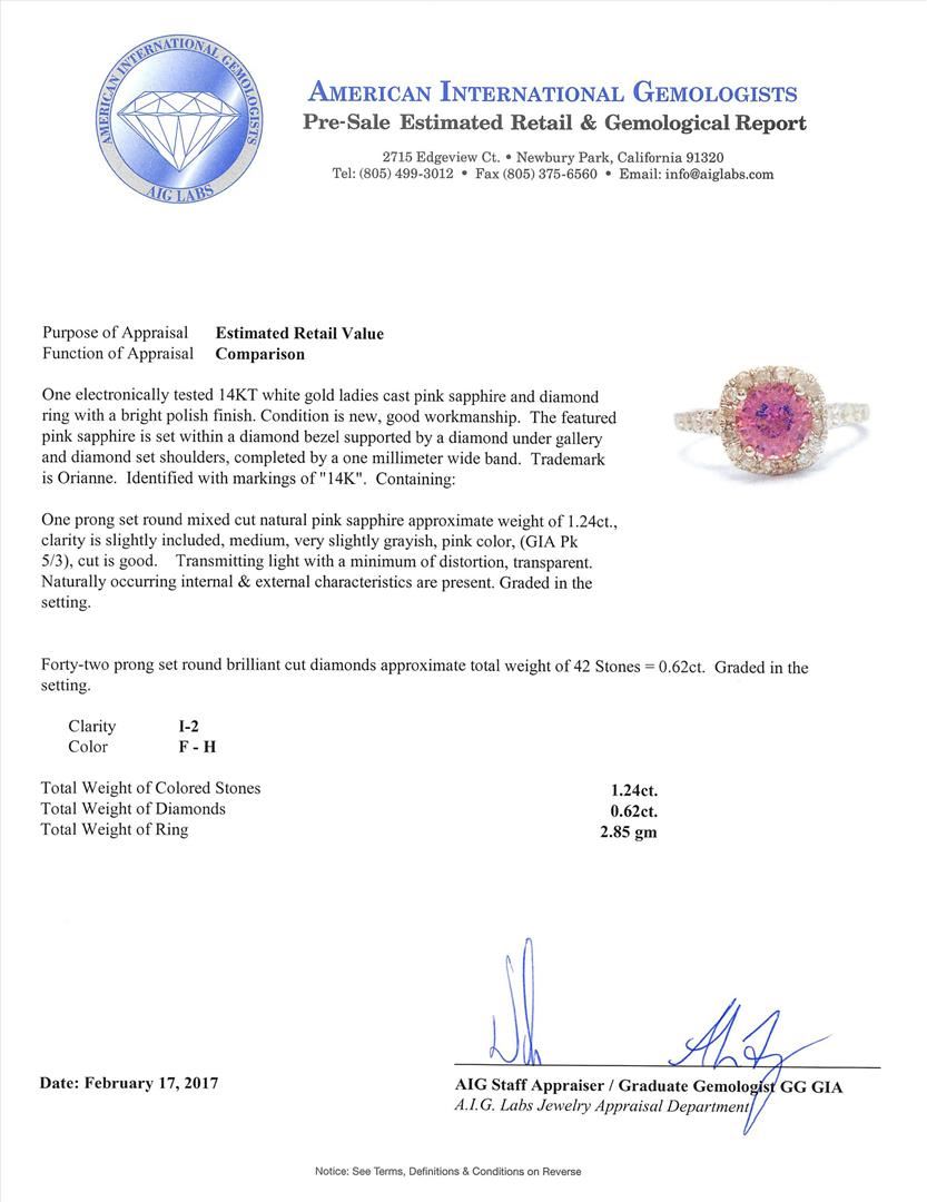 One electronically tested 14KT white gold ladies cast pink sapphire and diamond ring with a bright polish finish. The featured pink sapphire is set within a diamond bezel supported by a diamond under gallery and diamond set shoulders, completed by a one millimeter wide band. Trademark is Orianne. Identified with markings of "14K". Condition is new, good workmanship. Containing: One prong set round mixed cut natural pink sapphire approximate weight of 1.24ct., clarity is slightly included, medium, very slightly grayish, pink color, (GIA Pk 5/3), cut is good. Transmitting light with a minimum of distortion, transparent. Naturally occurring internal & external characteristics are present. Graded in the setting.Forty-Two prong set round brilliant cut diamonds approximate total weight of 42 Stones = 0.62ct. Graded in the setting. Clarity: I-2. Color: F - H. Total Weight of Colored Stones 1.24ct. Total Weight of Diamonds 0.62ct. Total Weight of Ring 2.85gm. AIG Appraised.