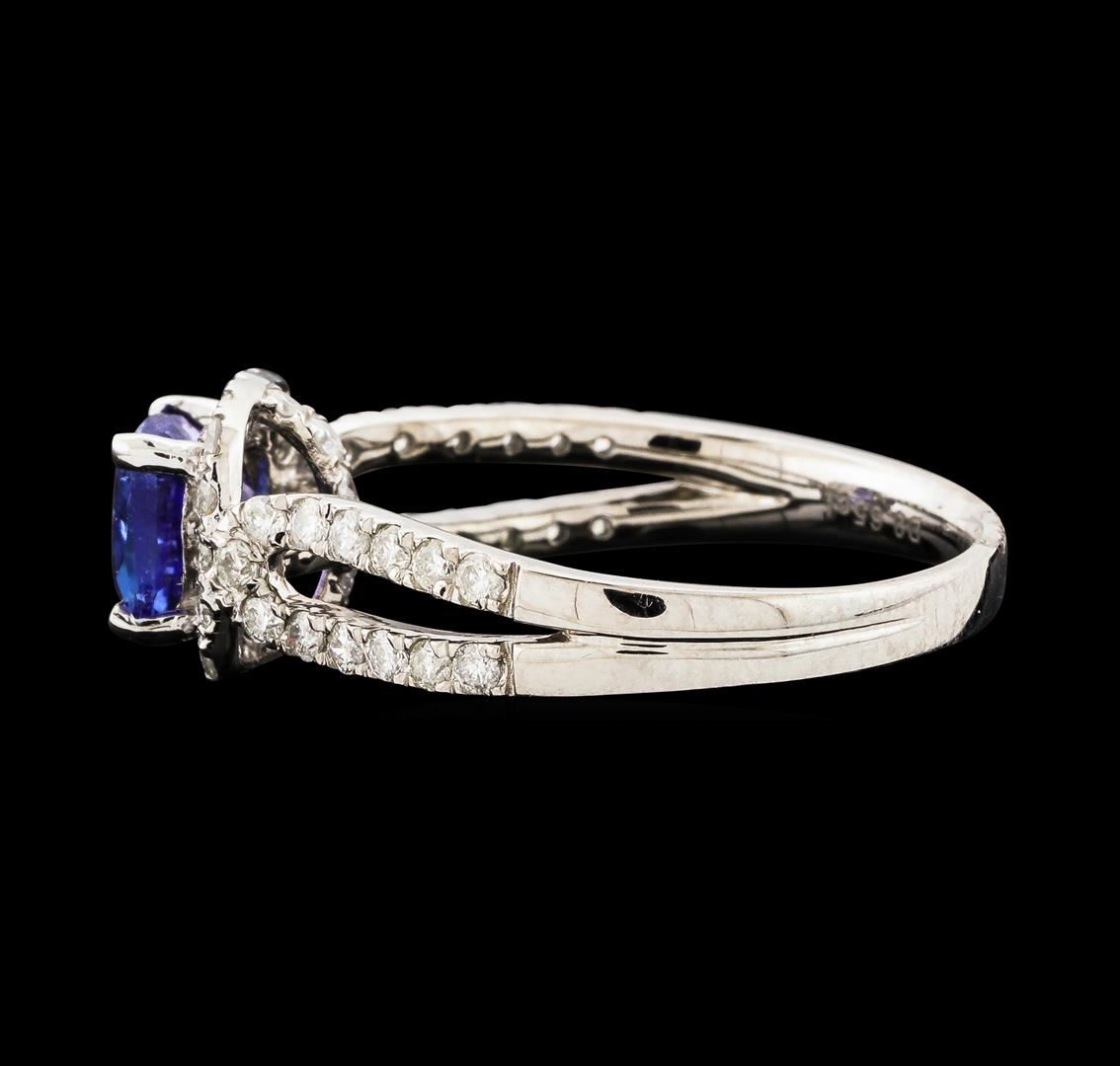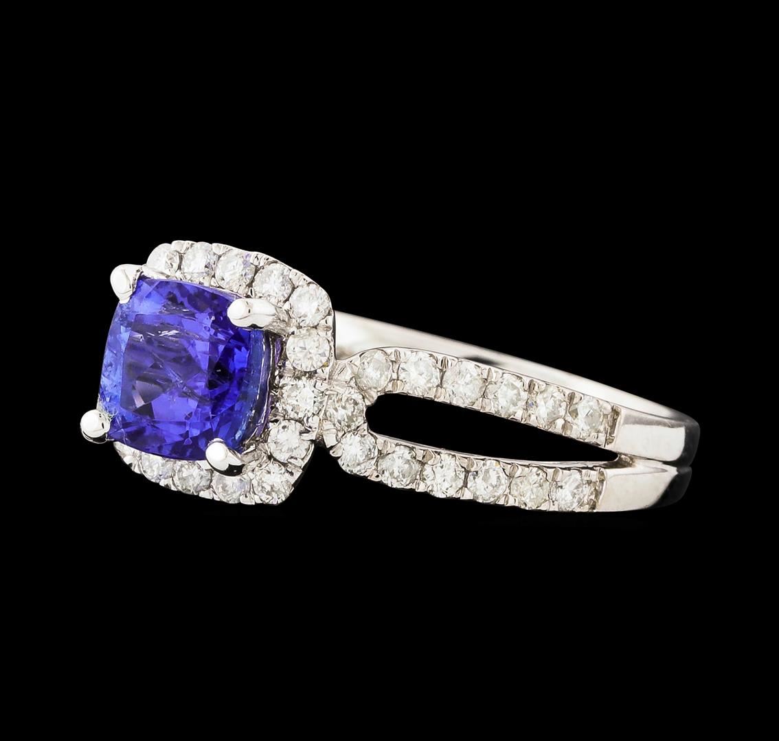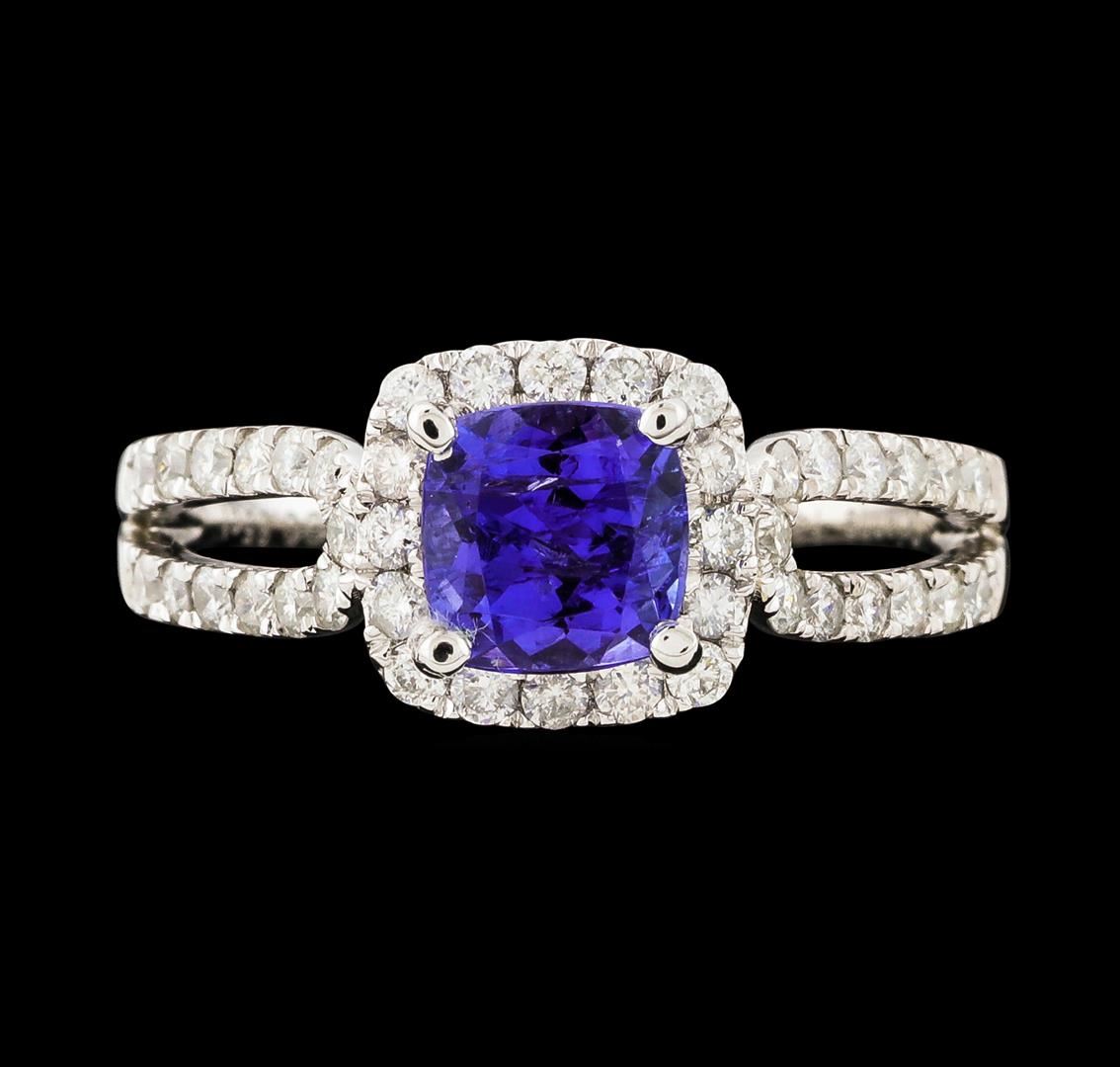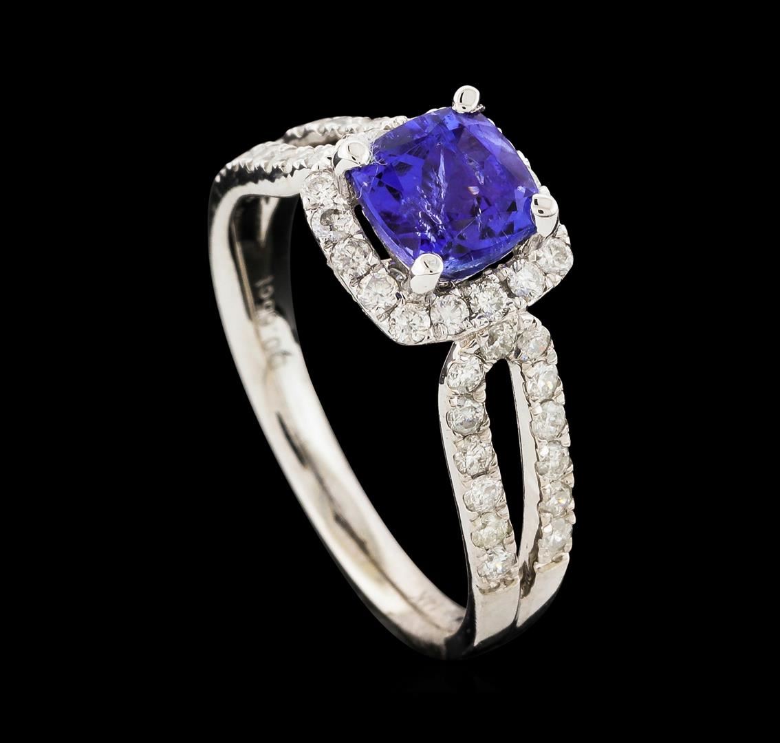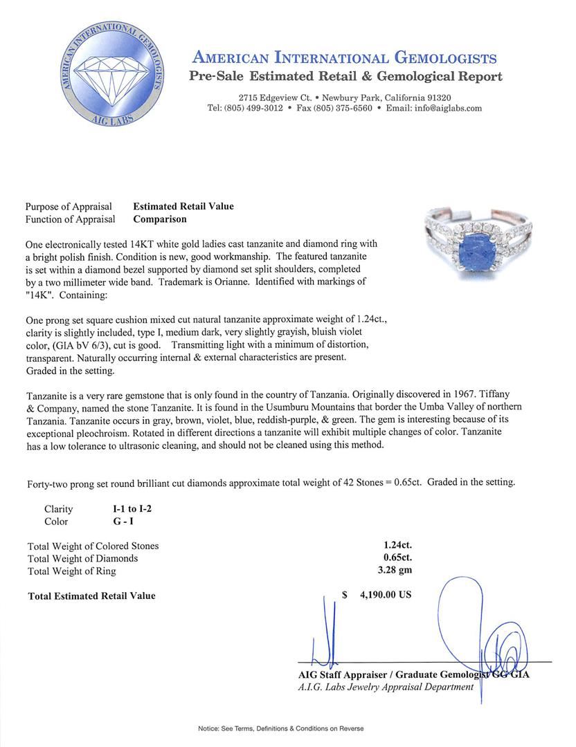 One electronically tested 14KT white gold ladies cast tanzanite and diamond ring with a bright polish finish. The featured tanzanite is set within a diamond bezel supported by diamond set split shoulders, completed by a two millimeter wide band. Trademark is Orianne. Identified with markings of "14K". Condition is new, good workmanship. Containing: One prong set square cushion mixed cut natural tanzanite approximate weight of 1.24ct., clarity is slightly included, type I, medium dark, very slightly grayish, bluish violet color, (GIA bV 6/3), cut is good. Transmitting light with a minimum of distortion, transparent. Naturally occurring internal & external characteristics are present. Graded in the setting. Tanzanite is a very rare gemstone that is only found in the country of Tanzania. Originally discovered in 1967. Tiffany & Company, named the stone Tanzanite. It is found in the Usumburu Mountains that border the Umba Valley of northern Tanzania. Tanzanite occurs in gray, brown, violet, blue, reddish-purple, & green. The gem is interesting because of its exceptional pleochroism. Rotated in different directions a tanzanite will exhibit multiple changes of color. Tanzanite has a low tolerance to ultrasonic cleaning, and should not be cleaned using this method. Forty-Two prong set round brilliant cut diamonds approximate total weight of 42 Stones = 0.65ct. Graded in the setting. Clarity: I-1 to I-2. Color: G - I. Total Weight of Colored Stones 1.24ct. Total Weight of Diamonds 0.65ct. Total Weight of Ring 3.28gm. AIG Appraised at $4,190.00.