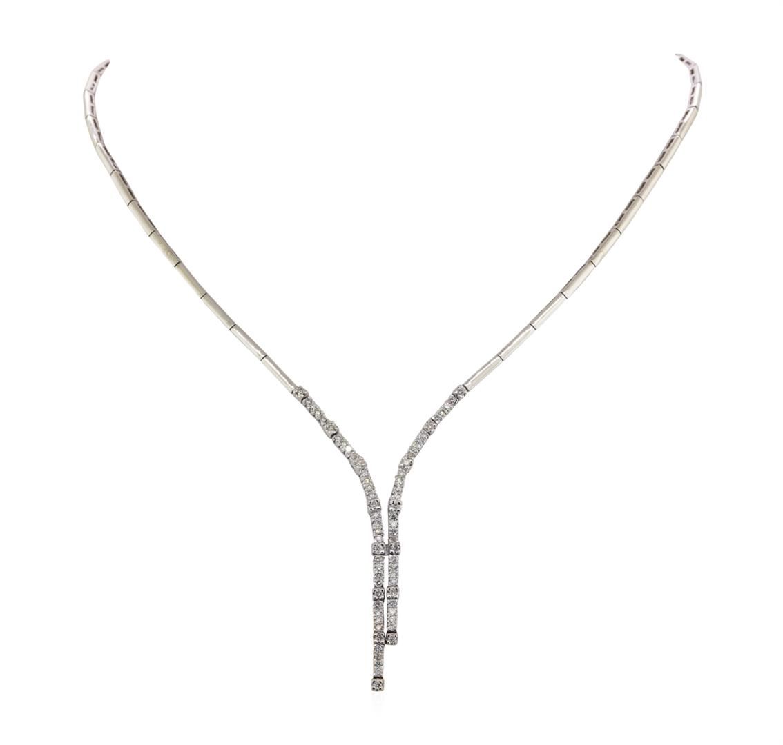 One electronically tested 14KT white gold lady's combination cast & assembled fashion necklace with a tongue clasp & foldover safety with a chevron motif with a bright polish finish. The featured lady's necklace measures approximately sixteen inches in length. Identified with markings of '14K'. Condition is new, good workmanship. Containing: Sixty-Seven prong set round brilliant cut diamonds, measuring 1.70 - 1.65 x 1.04mm (depth est.) approximate total weight of 67 Stones = 1.25ct. Graded in the setting. Color H - I Clarity SI-1 to I-1 Cut Good. Total Weight of Diamonds 1.25ct. Total Weight of Necklace 15.70gm. GAS Appraised.