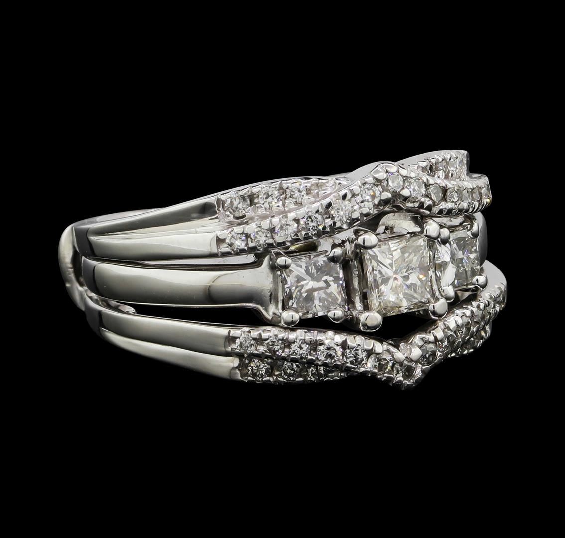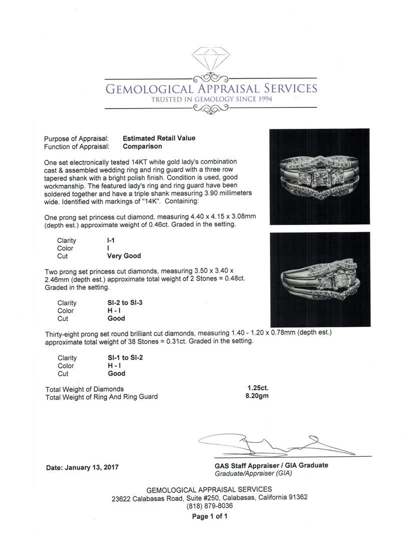 One set electronically tested 14KT white gold lady's combination cast & assembled wedding ring and ring guard with a three row tapered shank with a bright polish finish. The featured lady's ring and ring guard have been soldered together and have a triple shank measuring 3.90 millimeters wide. Identified with markings of "14K". Condition is used, good workmanship. Containing: One prong set princess cut diamond, measuring 4.40 x 4.15 x 3.08mm (depth est.) approximate weight of 0.46ct. Graded in the setting. Clarity: I-1. Color: ICut Very Good Two prong set princess cut diamonds, measuring 3.50 x 3.40 x 2.46mm (depth est.) approximate total weight of 2 Stones = 0.48ct. Graded in the setting. Clarity: SI-2 to SI-3. Color: H - ICut Good Thirty-Eight prong set round brilliant cut diamonds, measuring 1.40 - 1.20 x 0.78mm (depth est.) approximate total weight of 38 Stones = 0.31ct. Graded in the setting. Clarity: SI-1 to SI-2. Color: H - ICut Good. Total Weight of Diamonds 1.25ct. Total Weight of Ring And Ring Guard 8.20gm. GAS Appraised.