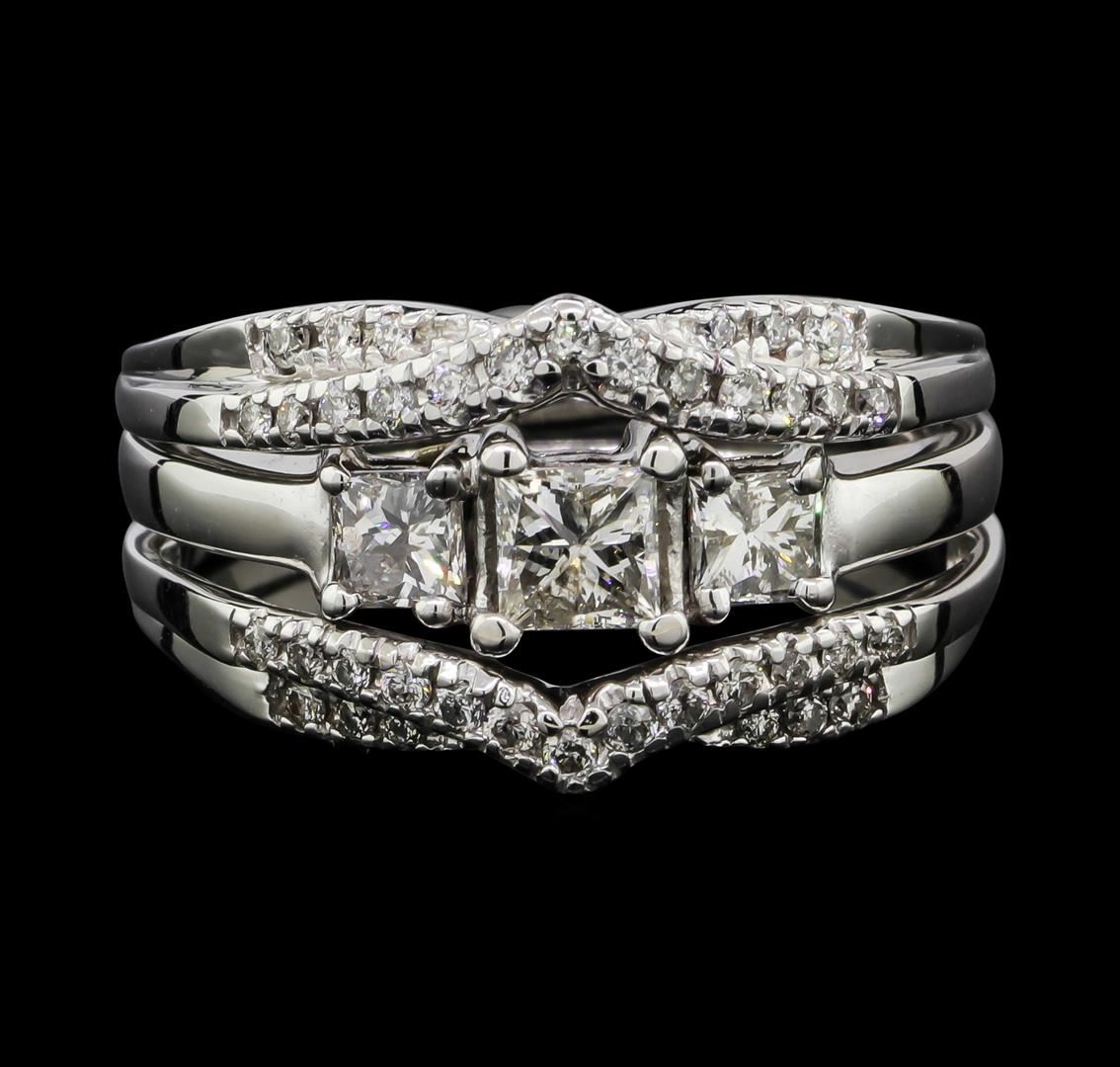 One set electronically tested 14KT white gold lady's combination cast & assembled wedding ring and ring guard with a three row tapered shank with a bright polish finish. The featured lady's ring and ring guard have been soldered together and have a triple shank measuring 3.90 millimeters wide. Identified with markings of "14K". Condition is used, good workmanship. Containing: One prong set princess cut diamond, measuring 4.40 x 4.15 x 3.08mm (depth est.) approximate weight of 0.46ct. Graded in the setting. Clarity: I-1. Color: ICut Very Good Two prong set princess cut diamonds, measuring 3.50 x 3.40 x 2.46mm (depth est.) approximate total weight of 2 Stones = 0.48ct. Graded in the setting. Clarity: SI-2 to SI-3. Color: H - ICut Good Thirty-Eight prong set round brilliant cut diamonds, measuring 1.40 - 1.20 x 0.78mm (depth est.) approximate total weight of 38 Stones = 0.31ct. Graded in the setting. Clarity: SI-1 to SI-2. Color: H - ICut Good. Total Weight of Diamonds 1.25ct. Total Weight of Ring And Ring Guard 8.20gm. GAS Appraised.