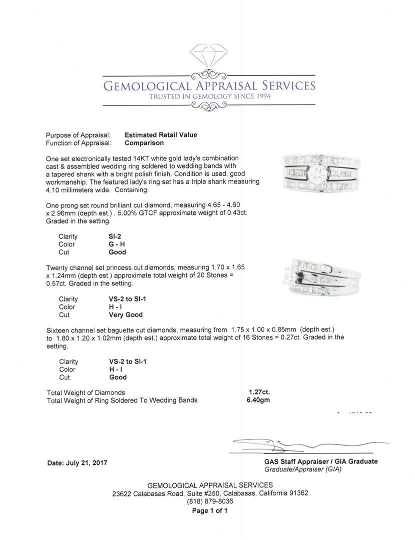 One set electronically tested 14KT white gold Ladies combination cast & assembled wedding ring soldered to wedding bands with a tapered shank with a bright polish finish. The featured Ladies ring set has a triple shank measuring 4.10 millimeters wide. Condition is used, good workmanship. Containing: One prong set round brilliant cut diamond, measuring 4.65 - 4.60 x 2.96mm (depth est.) , 5.00.%. GTCF approximate weight of 0.43ct. Graded in the setting. Color G - H Clarity SI-2 Cut Good Twenty channel set princess cut diamonds, measuring 1.70 x 1.65 x 1.24mm (depth est.) approximate total weight of 20 Stones = 0.57ct. Graded in the setting. Color H - I Clarity VS-2 to SI-1 Cut Very Good Sixteen channel set baguette cut diamonds, measuring from 1.75 x 1.00 x 0.85mm (depth est.) to 1.80 x 1.20 x 1.02mm (depth est.) approximate total weight of 16 Stones = 0.27ct. Graded in the setting. Color H - I Clarity VS-2 to SI-1 Cut Good. Total Weight of Diamonds 1.27ct. Total Weight of Ring Soldered To Wedding Bands 6.40gm. GAS Appraised.