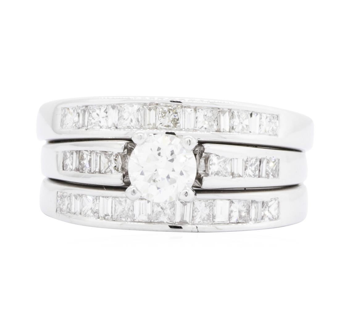 One set electronically tested 14KT white gold Ladies combination cast & assembled wedding ring soldered to wedding bands with a tapered shank with a bright polish finish. The featured Ladies ring set has a triple shank measuring 4.10 millimeters wide. Condition is used, good workmanship. Containing: One prong set round brilliant cut diamond, measuring 4.65 - 4.60 x 2.96mm (depth est.) , 5.00.%. GTCF approximate weight of 0.43ct. Graded in the setting. Color G - H Clarity SI-2 Cut Good Twenty channel set princess cut diamonds, measuring 1.70 x 1.65 x 1.24mm (depth est.) approximate total weight of 20 Stones = 0.57ct. Graded in the setting. Color H - I Clarity VS-2 to SI-1 Cut Very Good Sixteen channel set baguette cut diamonds, measuring from 1.75 x 1.00 x 0.85mm (depth est.) to 1.80 x 1.20 x 1.02mm (depth est.) approximate total weight of 16 Stones = 0.27ct. Graded in the setting. Color H - I Clarity VS-2 to SI-1 Cut Good. Total Weight of Diamonds 1.27ct. Total Weight of Ring Soldered To Wedding Bands 6.40gm. GAS Appraised.