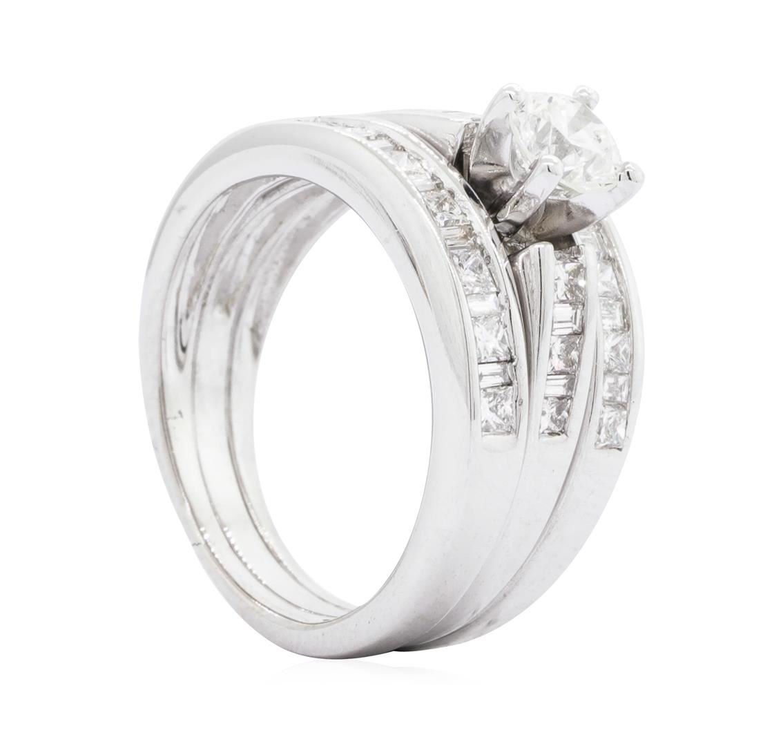 One set electronically tested 14KT white gold Ladies combination cast & assembled wedding ring soldered to wedding bands with a tapered shank with a bright polish finish. The featured Ladies ring set has a triple shank measuring 4.10 millimeters wide. Condition is used, good workmanship. Containing: One prong set round brilliant cut diamond, measuring 4.65 - 4.60 x 2.96mm (depth est.) , 5.00.%. GTCF approximate weight of 0.43ct. Graded in the setting. Color G - H Clarity SI-2 Cut Good Twenty channel set princess cut diamonds, measuring 1.70 x 1.65 x 1.24mm (depth est.) approximate total weight of 20 Stones = 0.57ct. Graded in the setting. Color H - I Clarity VS-2 to SI-1 Cut Very Good Sixteen channel set baguette cut diamonds, measuring from 1.75 x 1.00 x 0.85mm (depth est.) to 1.80 x 1.20 x 1.02mm (depth est.) approximate total weight of 16 Stones = 0.27ct. Graded in the setting. Color H - I Clarity VS-2 to SI-1 Cut Good. Total Weight of Diamonds 1.27ct. Total Weight of Ring Soldered To Wedding Bands 6.40gm. GAS Appraised.
