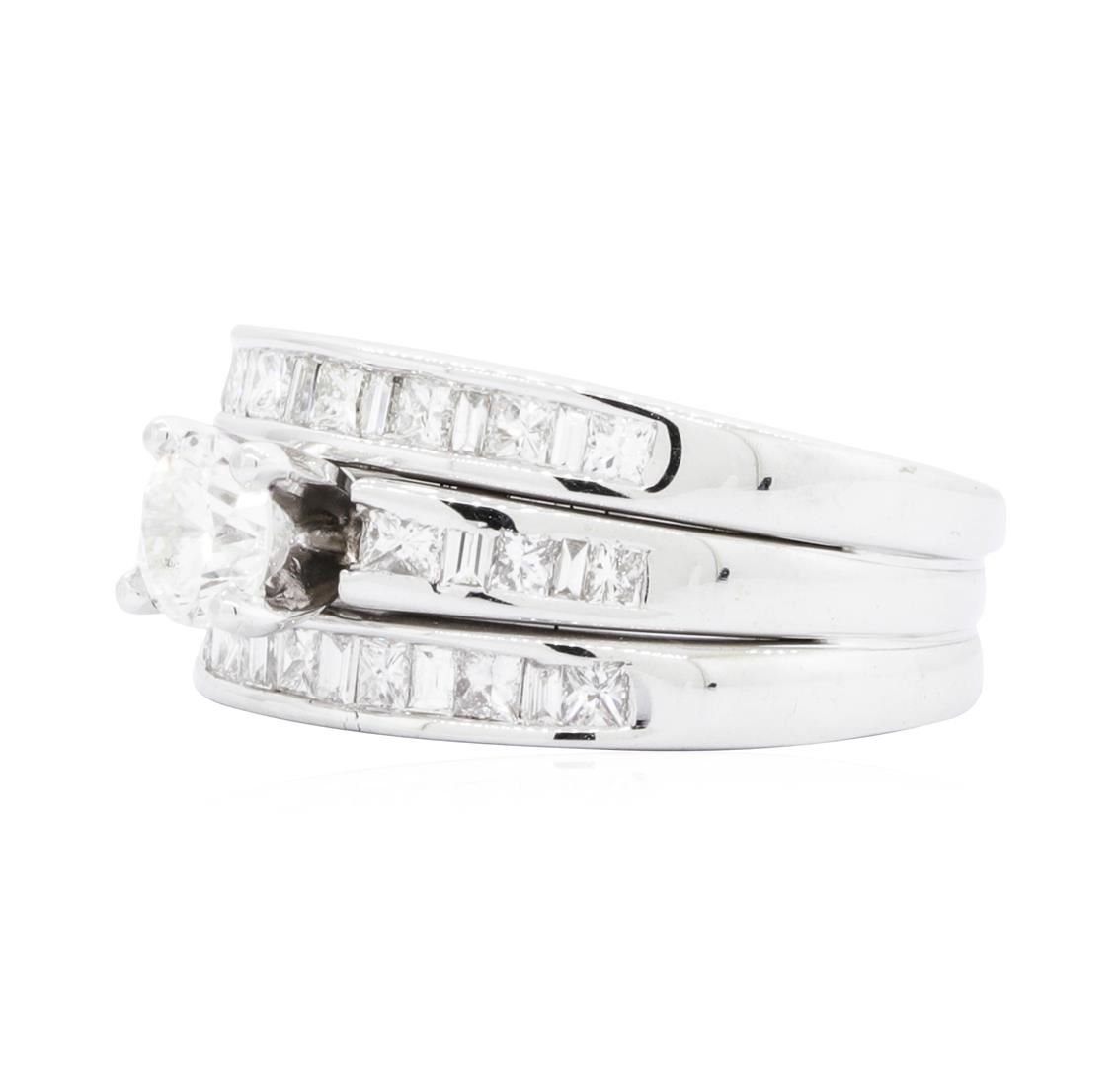 One set electronically tested 14KT white gold Ladies combination cast & assembled wedding ring soldered to wedding bands with a tapered shank with a bright polish finish. The featured Ladies ring set has a triple shank measuring 4.10 millimeters wide. Condition is used, good workmanship. Containing: One prong set round brilliant cut diamond, measuring 4.65 - 4.60 x 2.96mm (depth est.) , 5.00.%. GTCF approximate weight of 0.43ct. Graded in the setting. Color G - H Clarity SI-2 Cut Good Twenty channel set princess cut diamonds, measuring 1.70 x 1.65 x 1.24mm (depth est.) approximate total weight of 20 Stones = 0.57ct. Graded in the setting. Color H - I Clarity VS-2 to SI-1 Cut Very Good Sixteen channel set baguette cut diamonds, measuring from 1.75 x 1.00 x 0.85mm (depth est.) to 1.80 x 1.20 x 1.02mm (depth est.) approximate total weight of 16 Stones = 0.27ct. Graded in the setting. Color H - I Clarity VS-2 to SI-1 Cut Good. Total Weight of Diamonds 1.27ct. Total Weight of Ring Soldered To Wedding Bands 6.40gm. GAS Appraised.