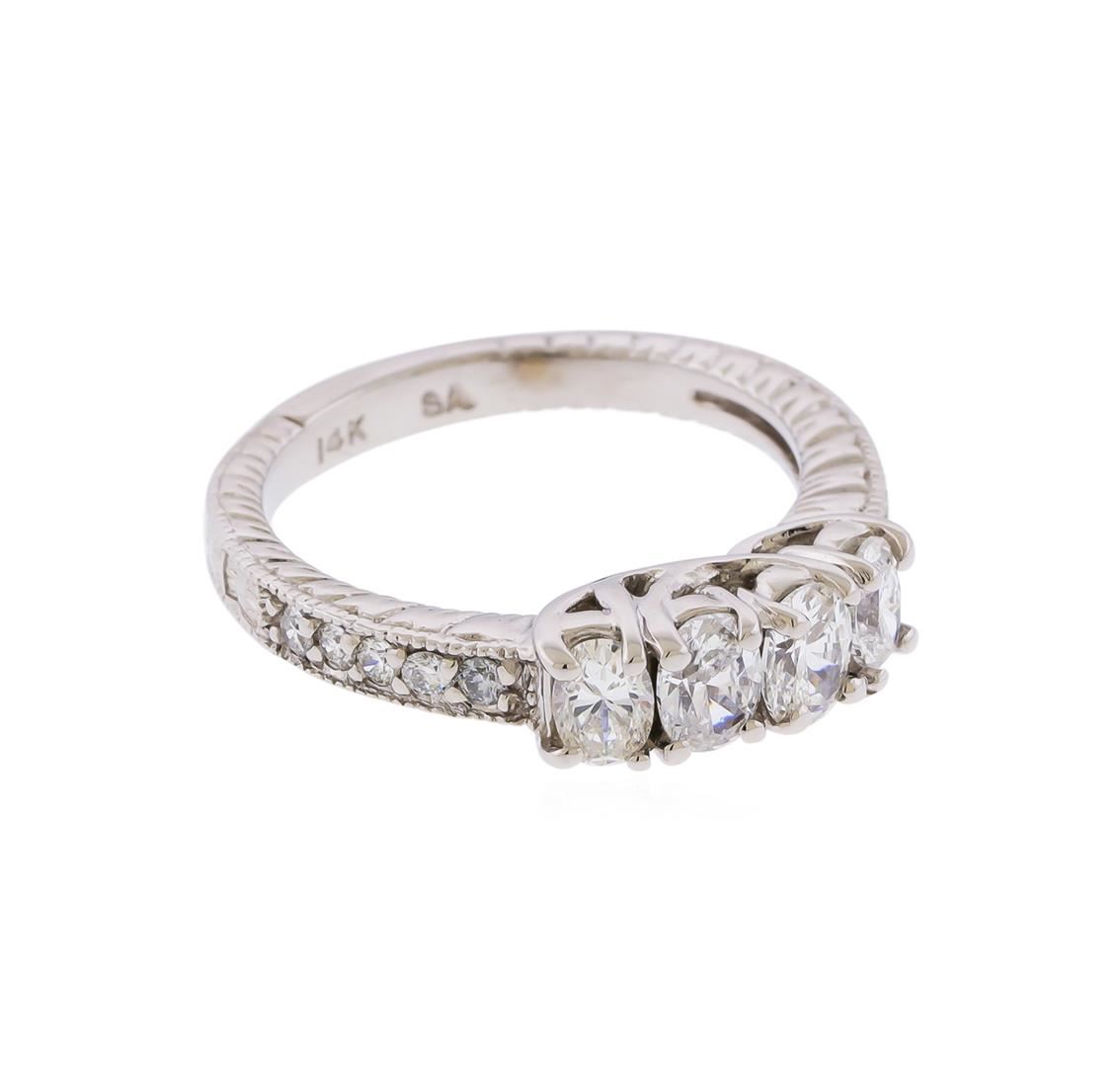 One electronically tested 14KT white gold ladies east diamond ring. Condition is new, good workmanship. The ring features a series of four oval shaped diamonds supported by round brilliant diamond set shoulders, completed by a patterned two and one-half millimeter wide band. Bright polish finish with milgrain detailing throughout. Identified with markings of" 14K". Containing: Two prong set oval shaped cut diamonds, measuring 4.80 x 3.80 x 2.39mm (depth est.) approximate total weight Of 2 Stones = 0.56ct. Graded in the setting. Clarity VS-2 to Sl-2, Color H -I. Two prong set oval shaped cut diamonds, measuring 4.50 x 3.30 x 2.08mm (depth est.) approximate total weight of 2 Stones 0.42Ct. Graded in the setting. Clarity VS-2 to SI-1, Color H-I. Ten bead set round brilliant cut diamonds, measuring 1.80 - 1.70 x I .05mm (depth est.) approximate total weight of 10 Stones = 0.29ct. Graded in the setting. Clarity Sl-1 to SI-2, and color H-J. The total weight of diamonds is 1.27ctw, and the total weight of the ring is 4.75 grams. AIG Appraised at $5,785.00.