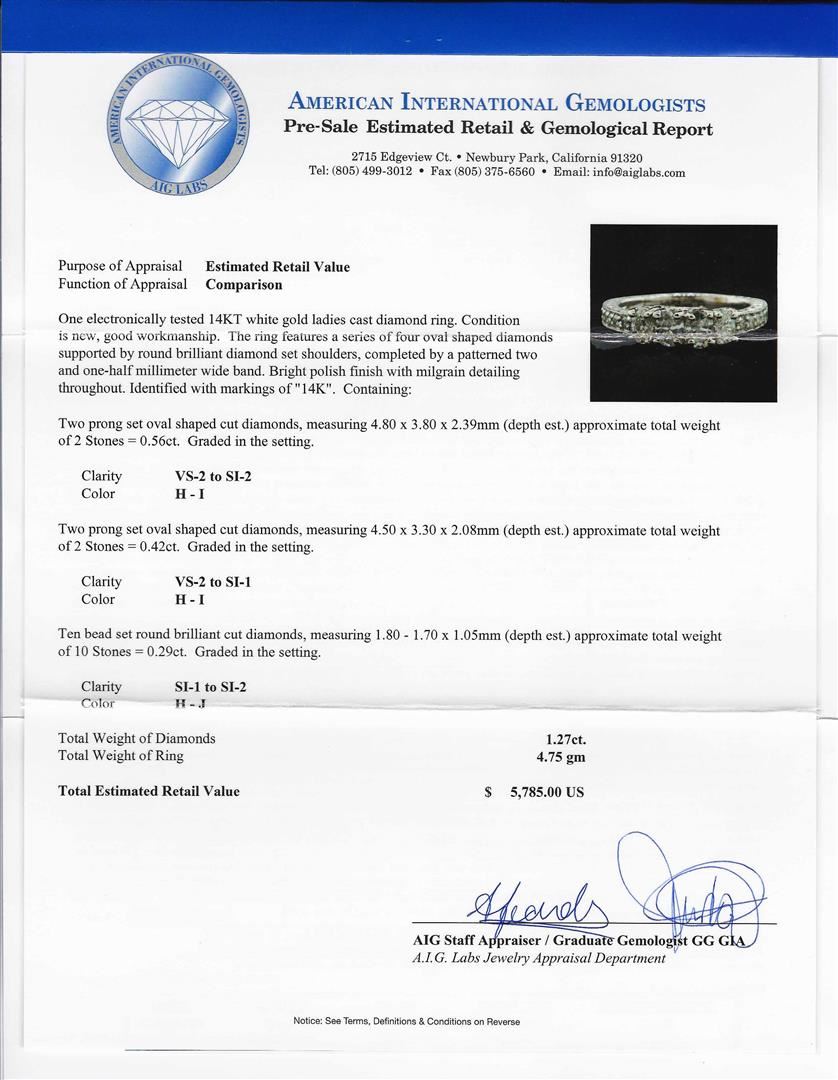 One electronically tested 14KT white gold ladies east diamond ring. Condition is new, good workmanship. The ring features a series of four oval shaped diamonds supported by round brilliant diamond set shoulders, completed by a patterned two and one-half millimeter wide band. Bright polish finish with milgrain detailing throughout. Identified with markings of" 14K". Containing: Two prong set oval shaped cut diamonds, measuring 4.80 x 3.80 x 2.39mm (depth est.) approximate total weight Of 2 Stones = 0.56ct. Graded in the setting. Clarity VS-2 to Sl-2, Color H -I. Two prong set oval shaped cut diamonds, measuring 4.50 x 3.30 x 2.08mm (depth est.) approximate total weight of 2 Stones 0.42Ct. Graded in the setting. Clarity VS-2 to SI-1, Color H-I. Ten bead set round brilliant cut diamonds, measuring 1.80 - 1.70 x I .05mm (depth est.) approximate total weight of 10 Stones = 0.29ct. Graded in the setting. Clarity Sl-1 to SI-2, and color H-J. The total weight of diamonds is 1.27ctw, and the total weight of the ring is 4.75 grams. AIG Appraised at $5,785.00.