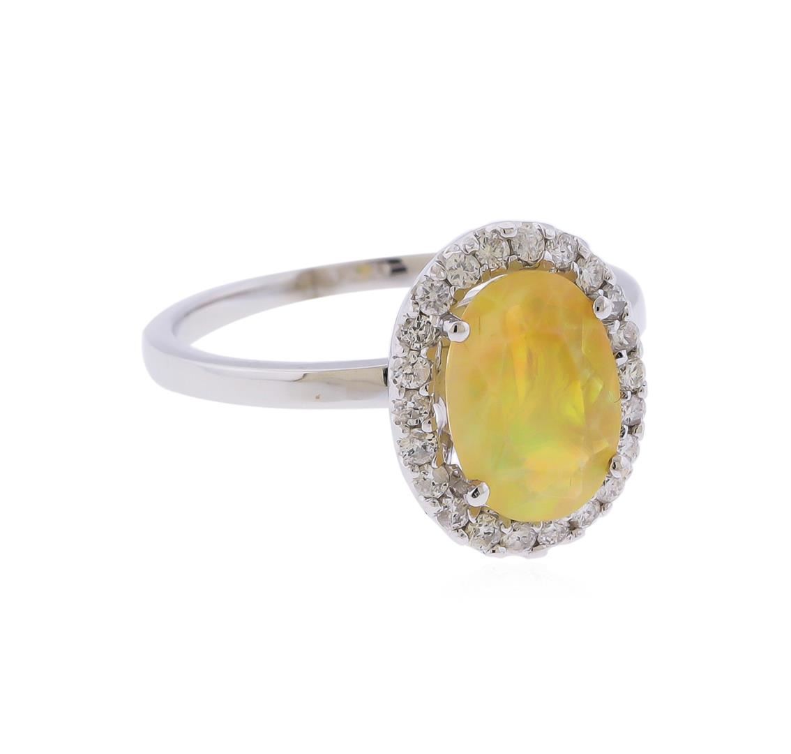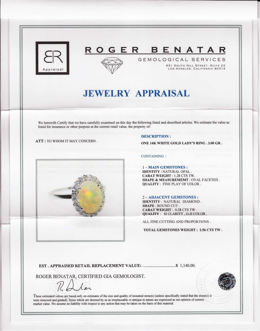 Containing 14K White Gold Ring weighing approximately 3.00 grams. (1) Oval Shaped natural opal weighing approximately 1.28cts; Surrounded by diamonds weighing approximately 0.28ctw, Clarity: SI Clarity, Color: G-H. RBGS Appraised at $1,140.00.
