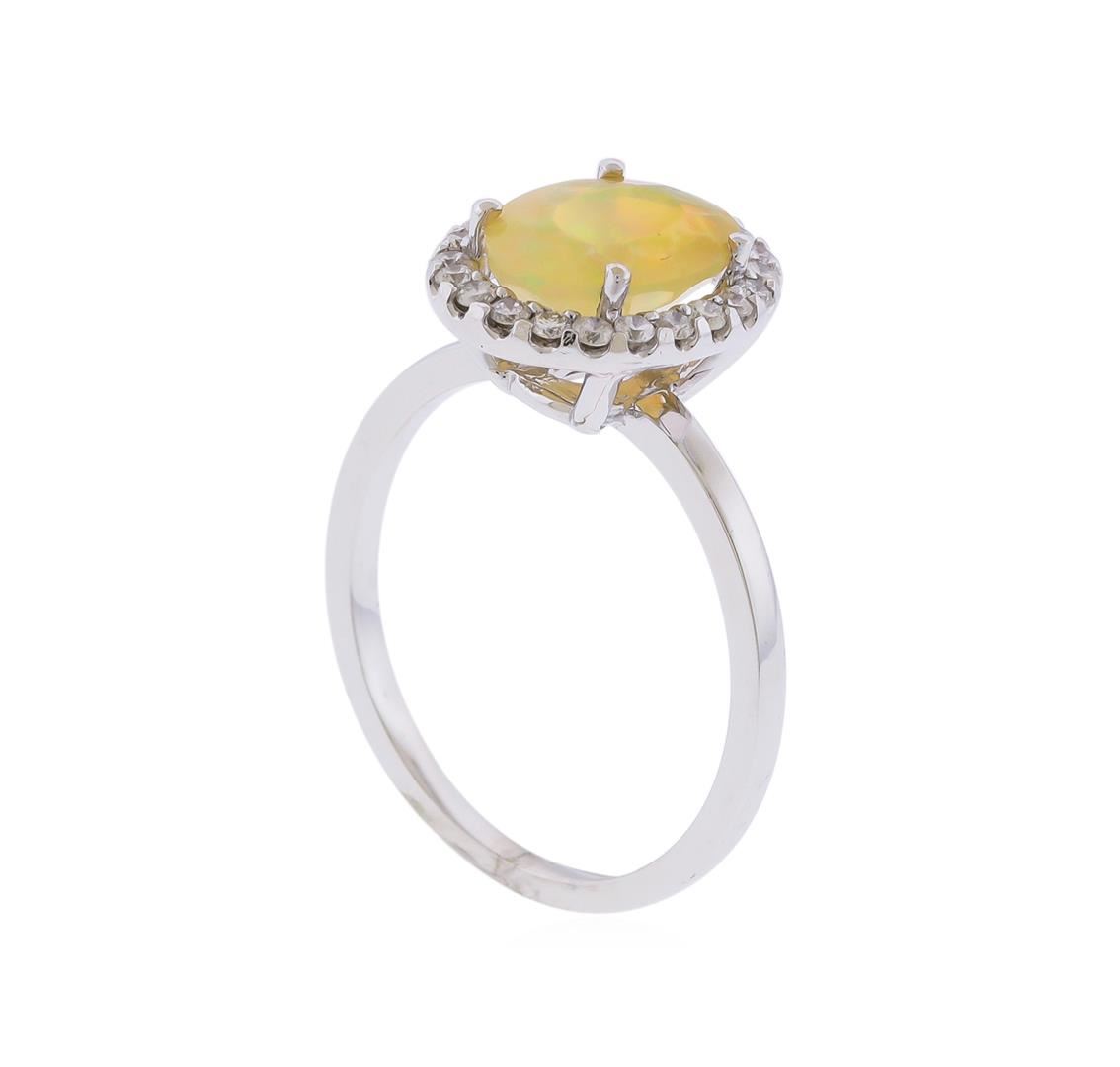 Containing 14K White Gold Ring weighing approximately 3.00 grams. (1) Oval Shaped natural opal weighing approximately 1.28cts; Surrounded by diamonds weighing approximately 0.28ctw, Clarity: SI Clarity, Color: G-H. RBGS Appraised.