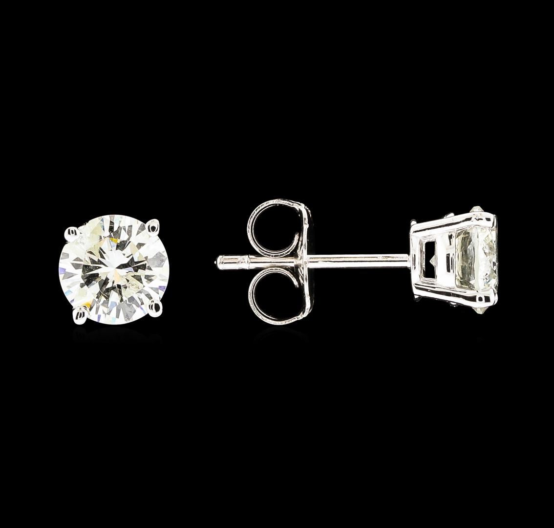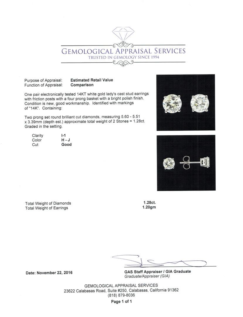One pair electronically tested 14KT white gold lady's cast stud earrings with friction posts with a four prong basket with a bright polish finish. Identified with markings of "14K". Condition is new, good workmanship. Containing: Two prong set round brilliant cut diamonds, measuring 5.60 - 5.51 x 3.39mm (depth est.) approximate total weight of 2 Stones = 1.28ct. Graded in the setting. Clarity: I-1. Color: H - JCut Good. Total Weight of Diamonds 1.28ct. Total Weight of Earrings 1.20gm. GAS Appraised.