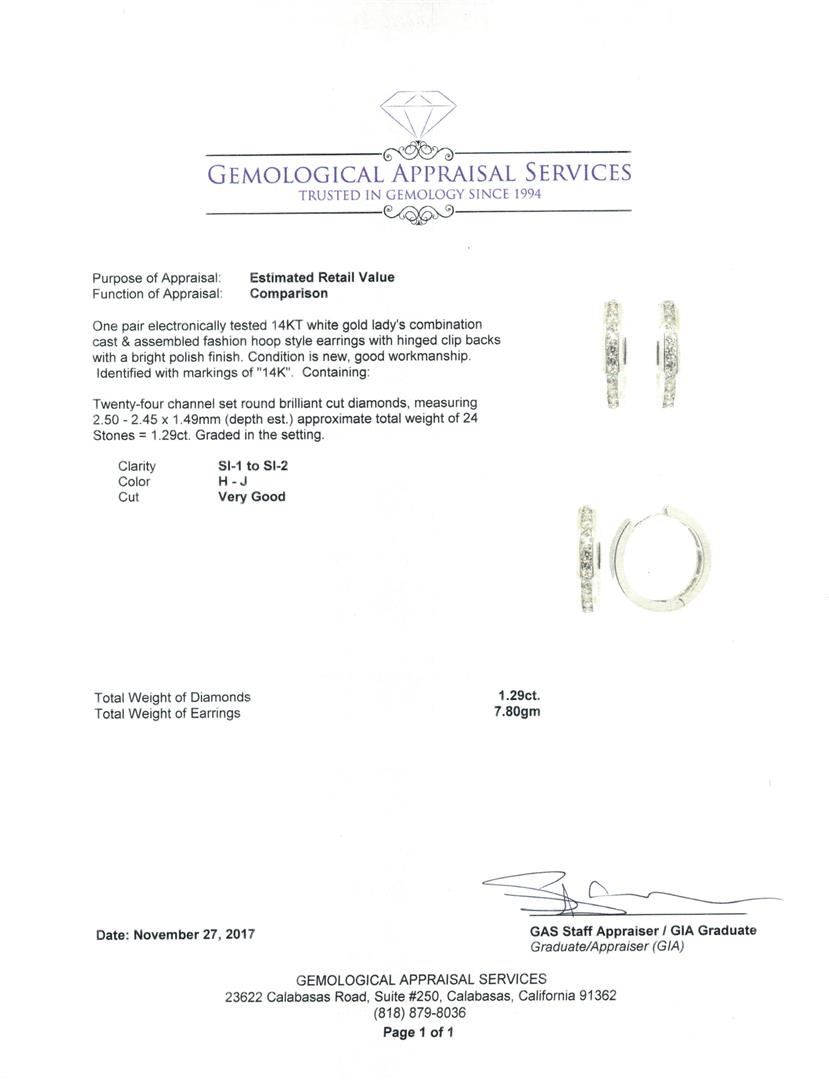 One pair electronically tested 14KT white gold lady's combination cast & assembled fashion hoop style earrings with hinged clip backs with a bright polish finish. Identified with markings of '14K'. Condition is new, good workmanship. Containing: Twenty-Four channel set round brilliant cut diamonds, measuring 2.50 - 2.45 x 1.49mm (depth est.) approximate total weight of 24 Stones = 1.29ct. Graded in the setting. Color H - J Clarity SI-1 to SI-2 Cut Very Good. Total Weight of Diamonds 1.29ct.. Total Weight of Earrings 7.80gm. GAS Appraised.
