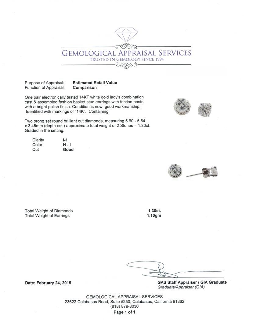 One pair electronically tested 14KT white gold lady's combination cast & assembled fashion basket stud earrings with friction posts with a bright polish finish. Identified with markings of '14K'. Condition is new, good workmanship. Containing: Two prong set round brilliant cut diamonds, measuring 5.60 - 5.54 x 3.45mm (depth est.) approximate total weight of 2 Stones = 1.30ct. Graded in the setting. Color H - I, Clarity I-1, Cut Good. Total Weight of Diamonds 1.30ct. Total Weight of Earrings 1.10gm. GAS Appraised.