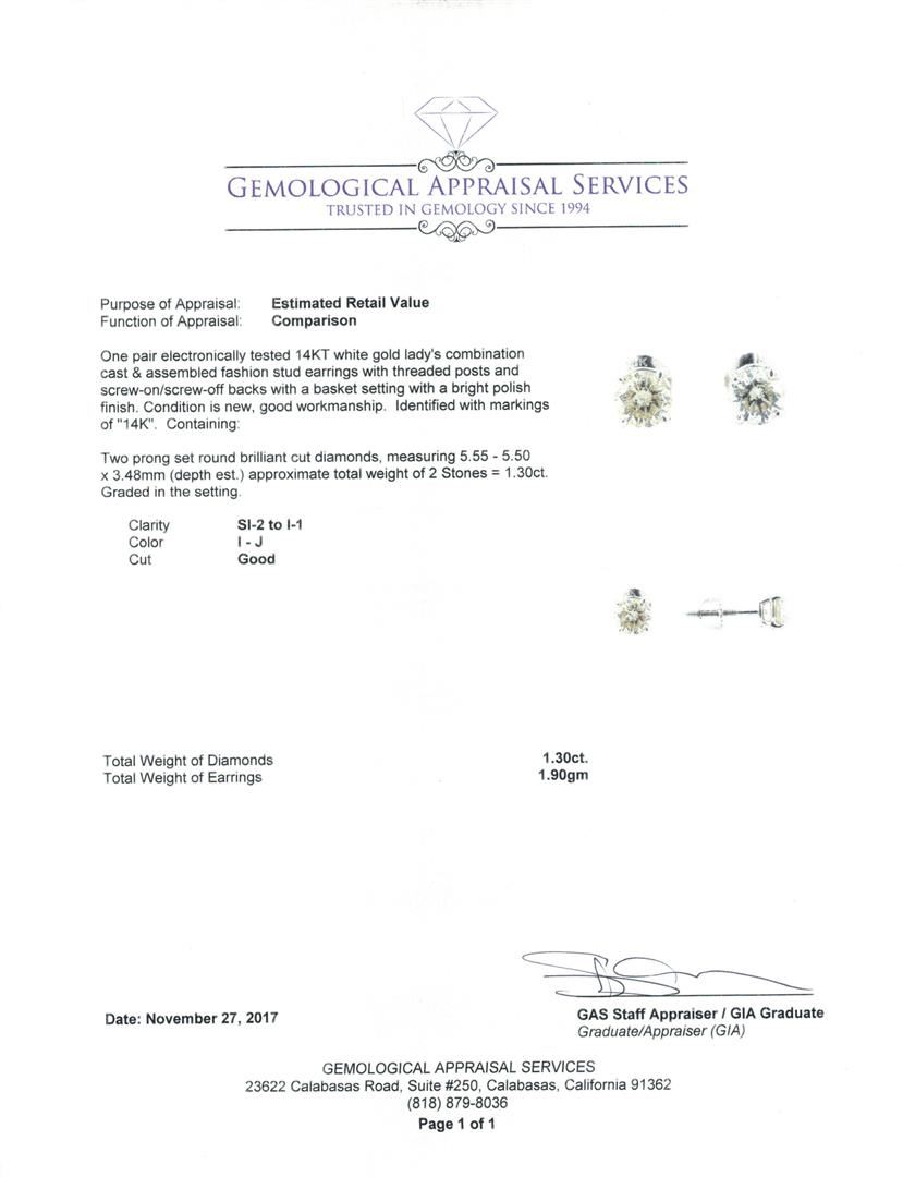 One pair electronically tested 14KT white gold lady's combination cast & assembled fashion stud earrings with threaded posts and screw-on/screw-off backs with a basket setting with a bright polish finish. Identified with markings of '14K'. Condition is new, good workmanship. Containing: Two prong set round brilliant cut diamonds, measuring 5.55 - 5.50 x 3.48mm (depth est.) approximate total weight of 2 Stones = 1.30ct. Graded in the setting. Color I - J Clarity SI-2 to I-1 Cut Good. Total Weight of Diamonds 1.30ct.. Total Weight of Earrings 1.90gm. GAS Appraised.