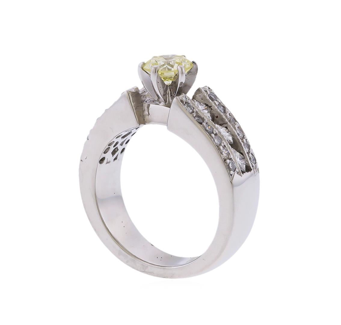 Fourteen karat (14K) white gold fancy light yellow and colorless round brilliant and princess cut diamond ring. A fancy light yellow round brilliant cut diamond, weighing approximately 0.55cts with a clarity of SI1 and a color of Fancy Light Yellow, is prong mounted in the center of the ring. Colorless round brilliant and princess cut diamonds, weighing approximately 0.75ctw with an average clarity SI-1 to SI2 and an average color G-H, accent the ring on both sides of center diamond. The ring is cast stamped '14K' and has a gross weight of 12.7 Grams. GGA Appraised at $6,720.00.
