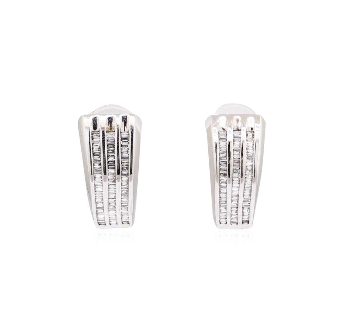 One pair of 3-row clip style earrings with posts featuring: 14KT white gold weighing 9.1 grams containing diamonds weighing 1.35ctw.