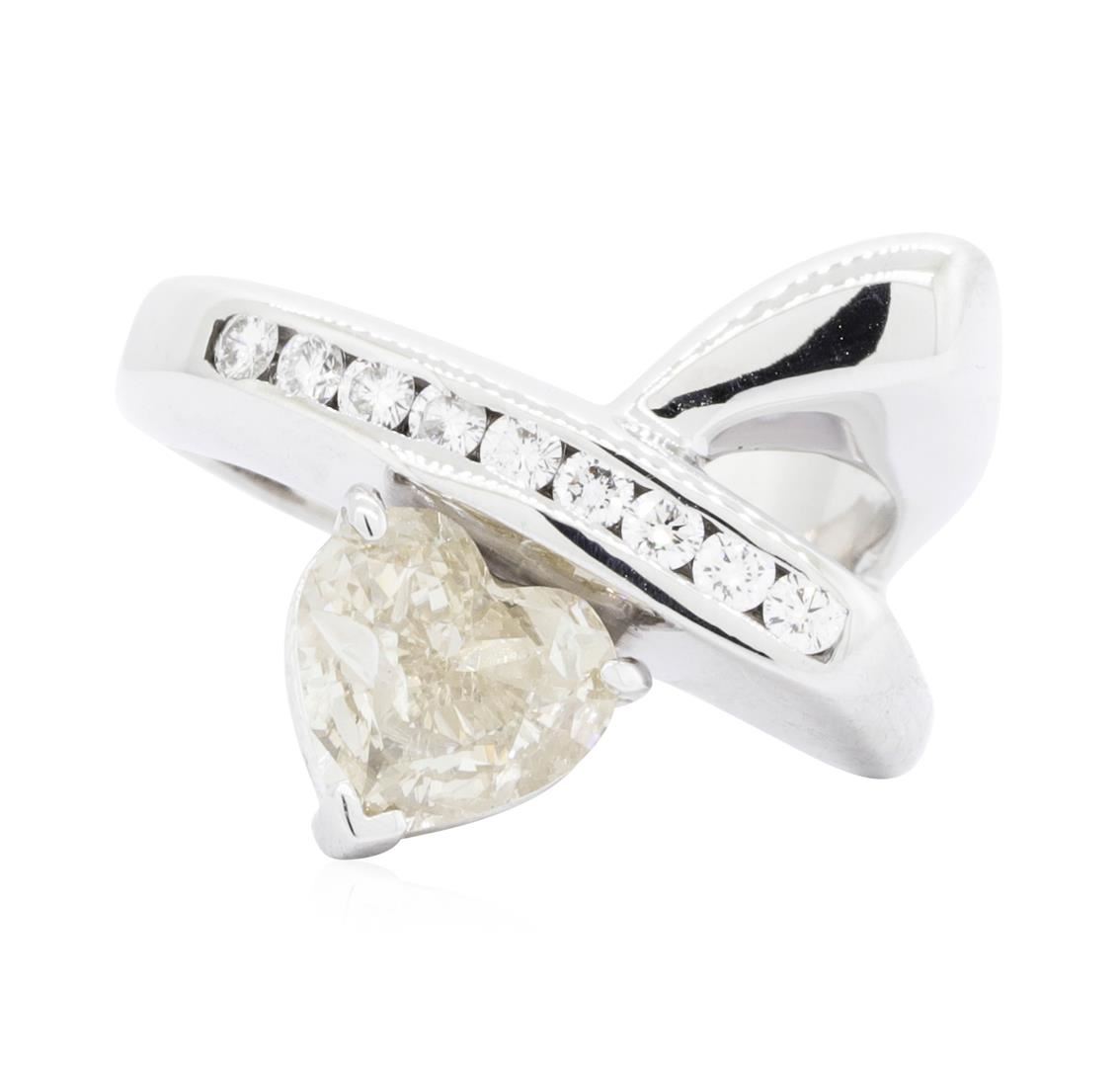 One electronically tested 14KT white gold Ladies cast fashion ring with a split crossover shank with a bright polish finish. The featured Ladies ring has a shank measuring 2.97 millimeters wide. Identified with markings of '14K'. Condition is new, good workmanship. Containing: One prong set heart shaped cut diamond, measuring 7.52 x 7.10 x 3.35mm (depth est.) approximate weight of 1.13ct. Graded in the setting. Color U - V Clarity I-1 Cut Very Good Nine channel set round brilliant cut diamonds, measuring 2.00 - 1.90 x 1.21mm (depth est.) approximate total weight of 9 Stones = 0.25ct. Graded in the setting. Color G - H Clarity VS-2 to SI-1 Cut Good. Total Weight of Diamonds 1.38ct. Total Weight of Ring 8.00gm. GAS Appraised.