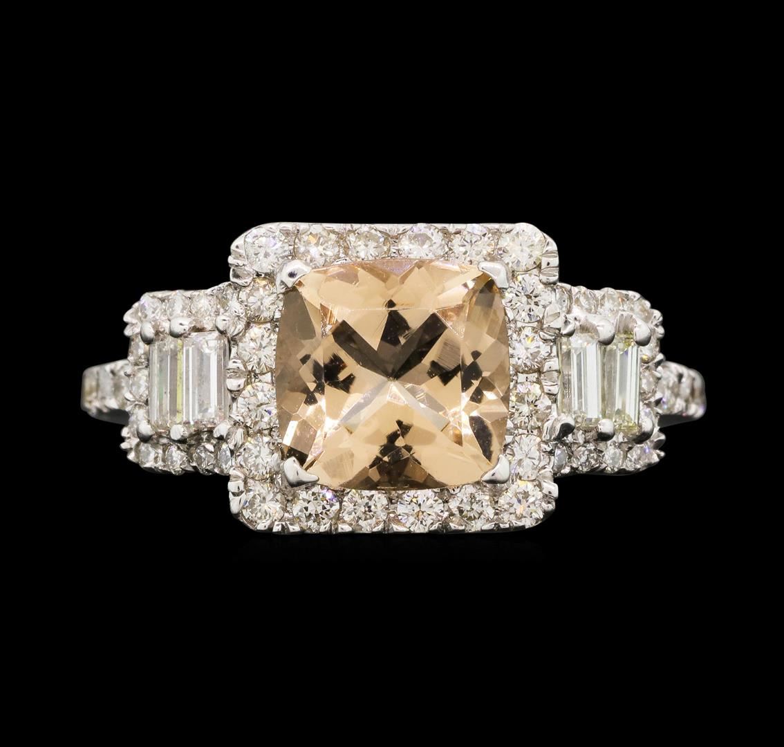 One electronically tested 14KT white gold lady's cast fashion ring with a square cushion halo with a bright polish finish. The featured lady's ring has a shank measuring 1.55 millimeters wide. Identified with markings of "14K". Condition is new, good workmanship. Containing: One prong set square cushion modified brilliant cut natural morganite, measuring 7.01 x 6.95 x 4.36mm, (depth est.) approximate weight of 1.40ct., clarity is eye clean, very light, very slightly brownish, reddish orange color, (GIA rO 2/3), cut is good. Transmitting light with no distortion, transparent. Colored gemstones are presumed to have been subjected to commonly used enhancement processes. Graded in the setting. Four prong set baguette cut diamonds, measuring from 2.95 x 1.40 x 1.19mm (depth est.) to 3.00 x 1.60 x 1.36mm (depth est.) approximate. Total Weight of 4 Stones = 0.22ct. Graded in the setting. Color H - I Clarity VS-2 to SI-1 Cut Very Good Thirty-Two prong set round brilliant cut diamonds, measuring 1.50 - 1.40 x 0.90mm (depth est.) approximate. Total Weight of 32 Stones = 0.37ct. Graded in the setting. Color H - I Clarity SI-1 to I-1 Cut Good Twenty-Two prong set round brilliant cut diamonds, measuring 1.10 - 1.00 x 0.65mm (depth est.) approximate. Total Weight of 22 Stones = 0.10ct. Graded in the setting. Color H - I Clarity SI-1 to I-1 Cut Good. Total Weight of Colored Stones 1.40ct.. Total Weight of Diamonds 0.69ct.. Total Weight of Ring 3.50gm. GAS Appraised.