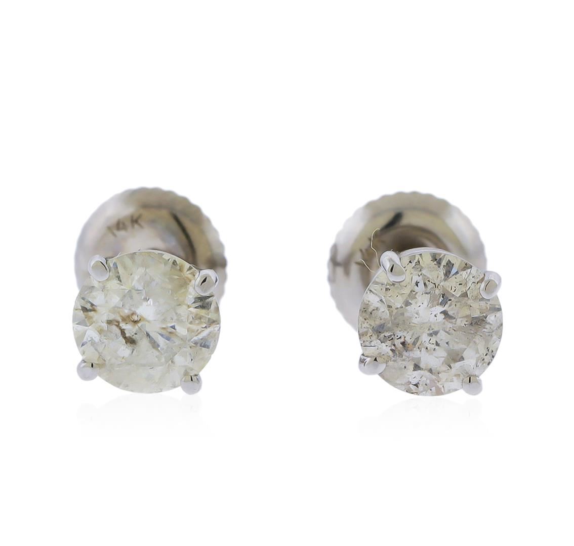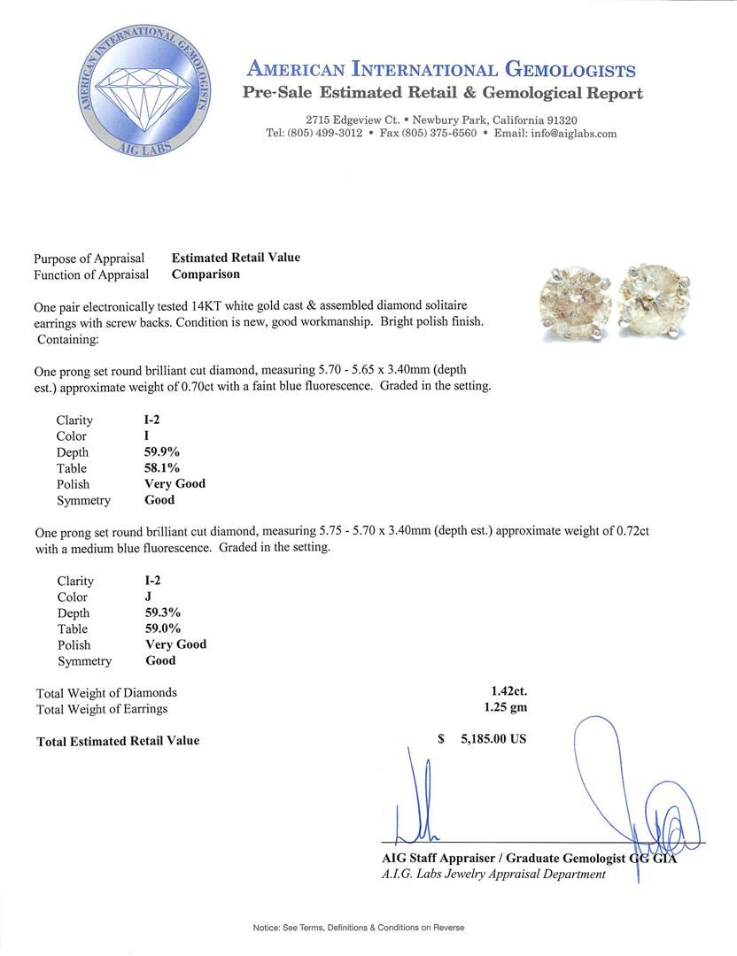 One pair electronically tested 14KT white gold cast & assembled diamond solitaire earrings with screw backs. Bright polish finish. Condition is new, good workmanship. Containing: One prong set round brilliant cut diamond, measuring 5.70 - 5.65 x 3.40mm (depth est.) approximate weight of 0.70ct with a faint blue fluorescence. Graded in the setting. Clarity: I-2. Color: IDepth 59.9%. Table 58.1%. One prong set round brilliant cut diamond, measuring 5.75 - 5.70 x 3.40mm (depth est.) approximate weight of 0.72ct with a medium blue fluorescence. Graded in the setting. Clarity: I-2. Color: JDepth 59.3%. Table 59.0%. Total Weight of Diamonds 1.42ct. Total Weight of Earrings 1.25gm. AIG Appraised at $5,185.00.