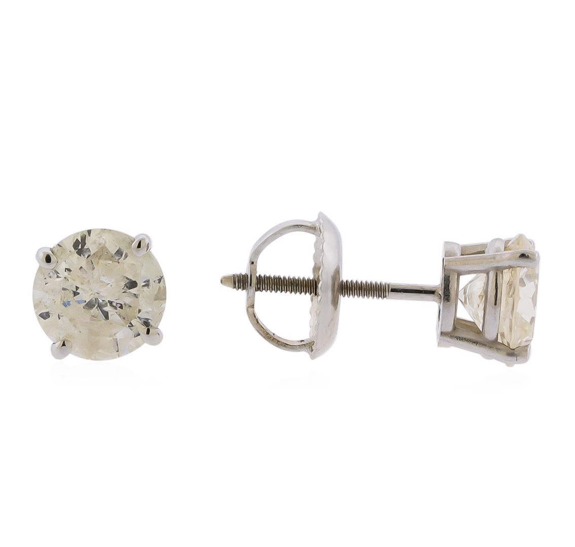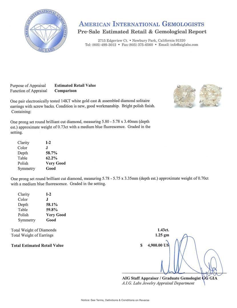 One pair electronically tested 14KT white gold cast & assembled diamond solitaire earrings with screw backs. Bright polish finish. Condition is new, good workmanship. Containing: One prong set round brilliant cut diamond, measuring 5.80 - 5.78 x 3.40mm (depth est.) approximate weight of 0.73ct with a medium blue fluorescence. Graded in the setting. Clarity: I-2. Color: JDepth 58.7%. Table 62.2%. One prong set round brilliant cut diamond, measuring 5.78 - 5.75 x 3.35mm (depth est.) approximate weight of 0.70ct with a medium blue fluorescence. Graded in the setting. Clarity: I-2. Color: JDepth 58.1%. Table 59.8%. Total Weight of Diamonds 1.43ct. Total Weight of Earrings 1.25gm. AIG Appraised at $4,900.00.