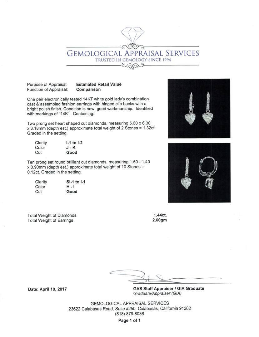 One pair electronically tested 14KT white gold lady's combination cast & assembled fashion earrings with hinged clip backs with a bright polish finish. Identified with markings of "14K". Condition is new, good workmanship. Containing: Two prong set heart shaped cut diamonds, measuring 5.60 x 6.30 x 3.18mm (depth est.) approximate total weight of 2 Stones = 1.32ct. Graded in the setting. Color J - K, Clarity I-1 to I-2 Cut Good Ten prong set round brilliant cut diamonds, measuring 1.50 - 1.40 x 0.90mm (depth est.) approximate total weight of 10 Stones = 0.12ct. Graded in the setting. Color H - I Clarity SI-1 to I-1 Cut Good. Total Weight of Diamonds 1.44ct. Total Weight of Earrings 2.60gm. GAS Appraised.