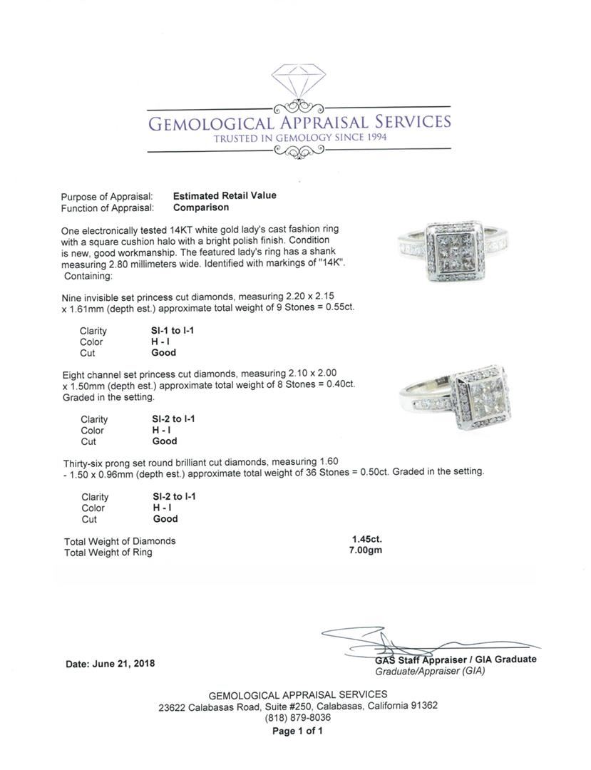 One electronically tested 14KT white gold lady's cast fashion ring with a square cushion halo with a bright polish finish. The featured lady's ring has a shank measuring 2.80 millimeters wide. Identified with markings of '14K'. Condition is new, good workmanship. Containing: Nine invisible set princess cut diamonds, measuring 2.20 x 2.15 x 1.61mm (depth est.) approximate total weight of 9 Stones = 0.55ct. Color H - I Clarity SI-1 to I-1 Cut Good Eight channel set princess cut diamonds, measuring 2.10 x 2.00 x 1.50mm (depth est.) approximate total weight of 8 Stones = 0.40ct. Graded in the setting. Color H - I Clarity SI-2 to I-1 Cut Good Thirty-Six prong set round brilliant cut diamonds, measuring 1.60 - 1.50 x 0.96mm (depth est.) approximate total weight of 36 Stones = 0.50ct. Graded in the setting. Color H - I Clarity SI-2 to I-1 Cut Good. Total Weight of Diamonds 1.45ct. Total Weight of Ring 7.00gm. GAS Appraised.